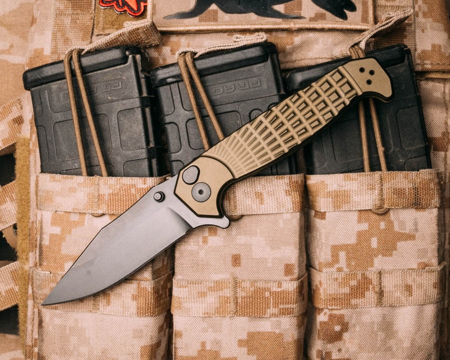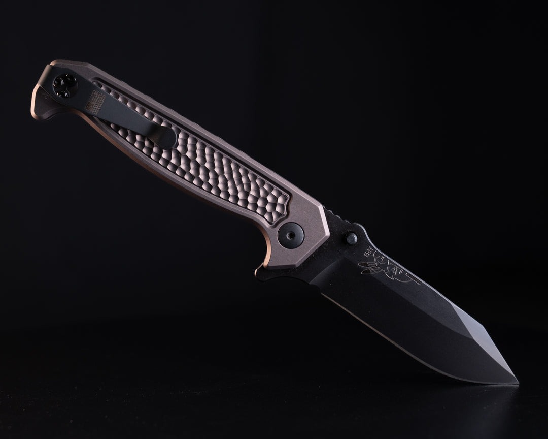 Half Face Blades – Vulture – gold camo carbon, armor black cerakote, brass allen bolts, iron grip, open tang