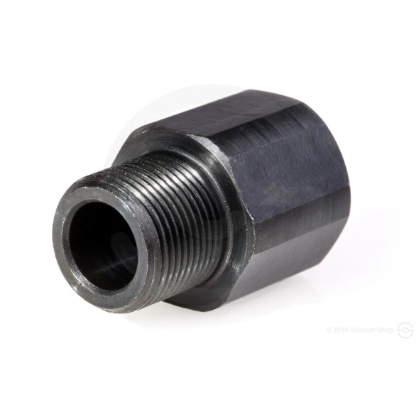 These custom thread adapters can be used to 1/2-28 rifles up to 5/8-24 thread pitch, so you may use 7.62mm suppressors in subcaliber role on AR15 and other 5.56mm rifles. Steel construction with sturdy wrench flats, in a dark gunblued finish.