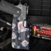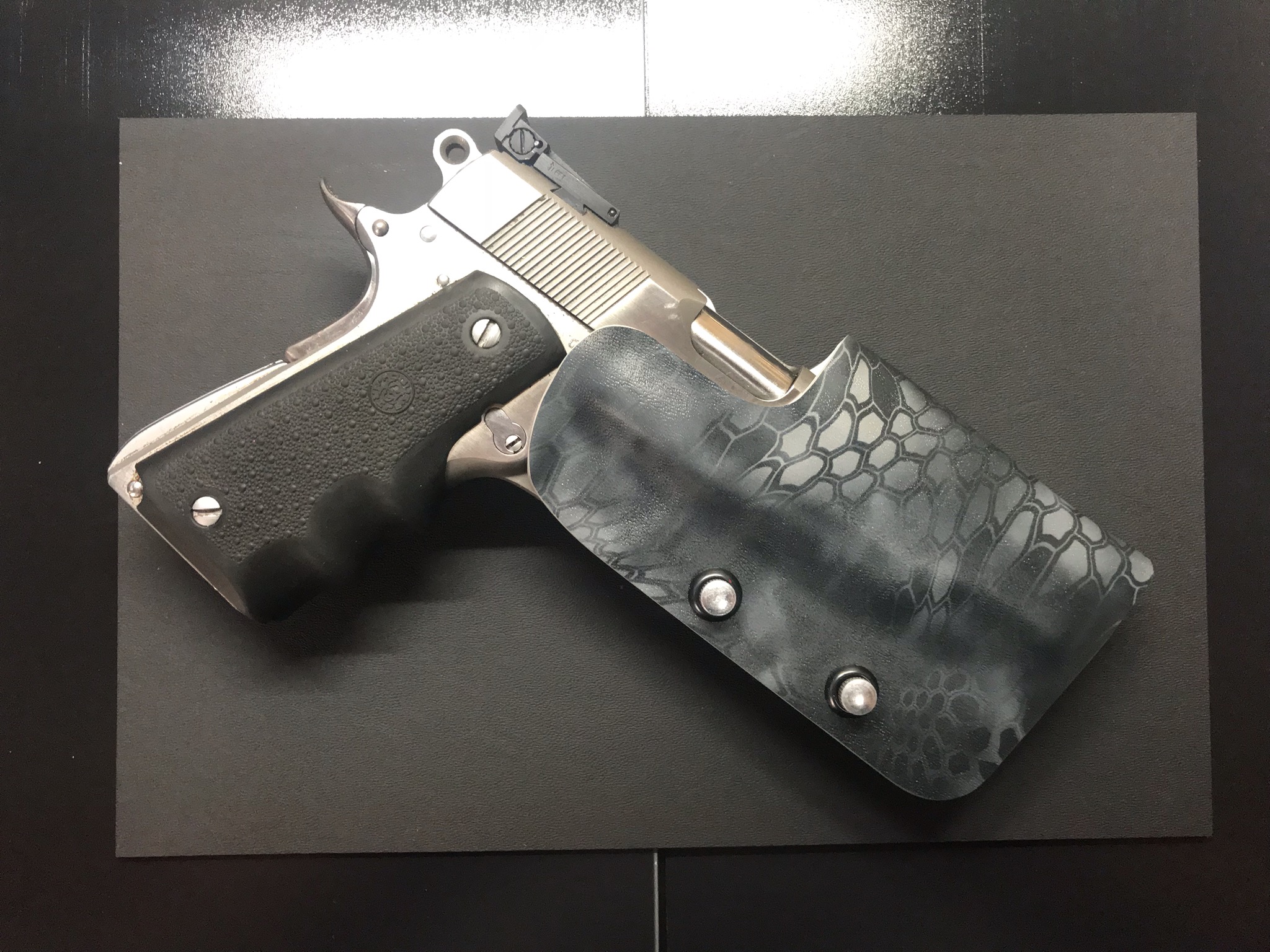 It is available only in the tried and true double layer configuration. This features two layers of .08 thick Kydex to add a great deal of structure to your holster. The extra rigidity supports the low cut that we use, as well as reduces the flex and bounce that happens when you cut this much out of a single layer of Kydex. In addition to the stability, it gives you the ability to further add to the custom look of your rig. We feature everything from solid colors, carbon fiber look, and many custom camouflage patterns including Kyrptek, Supercam, Hexcam and more.