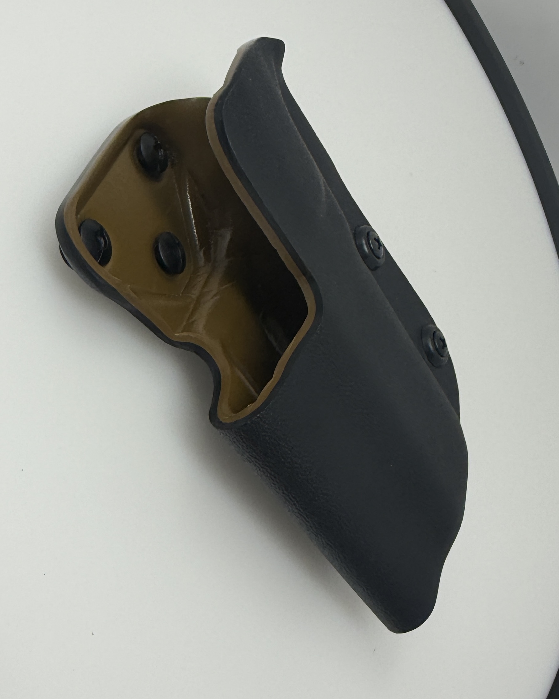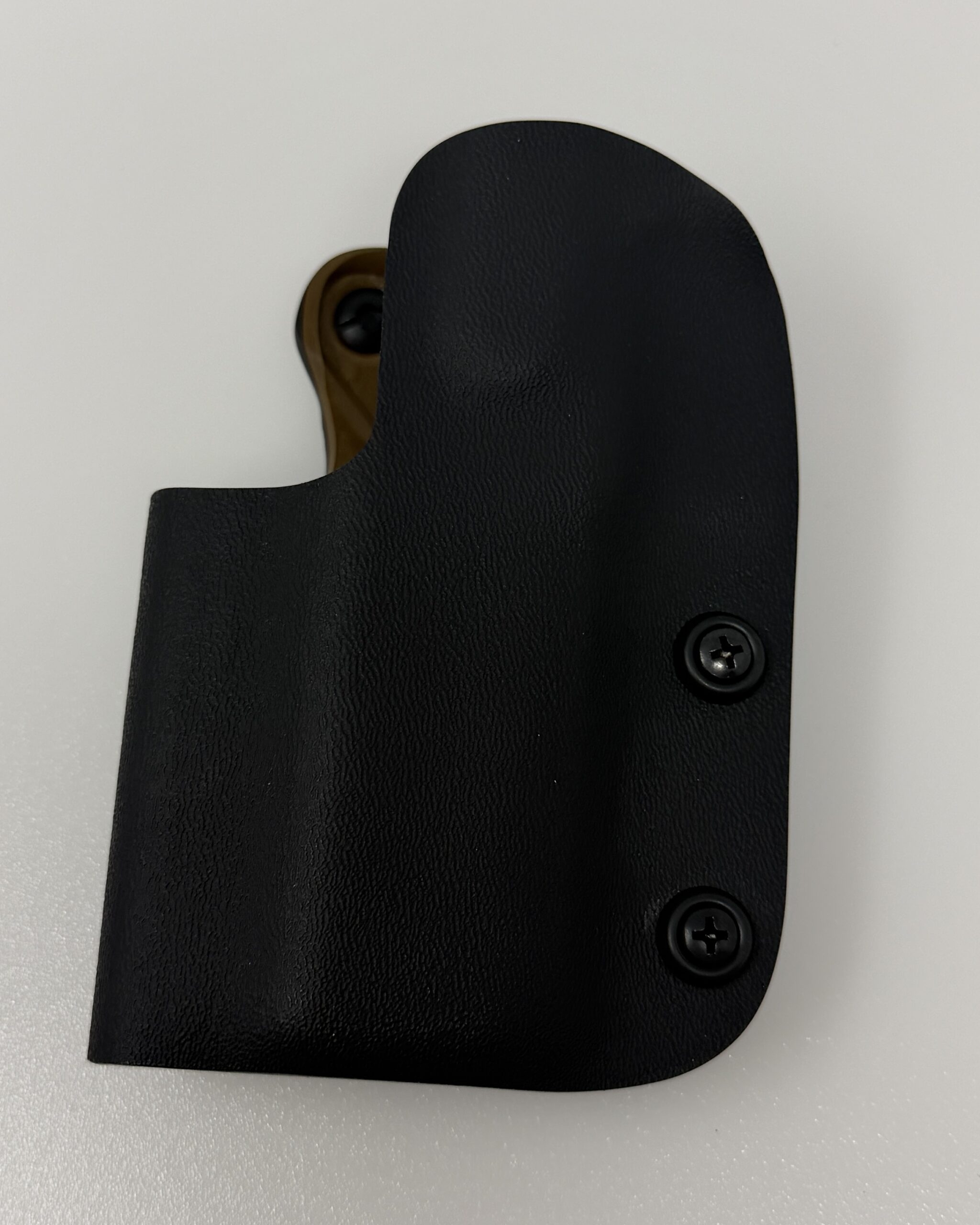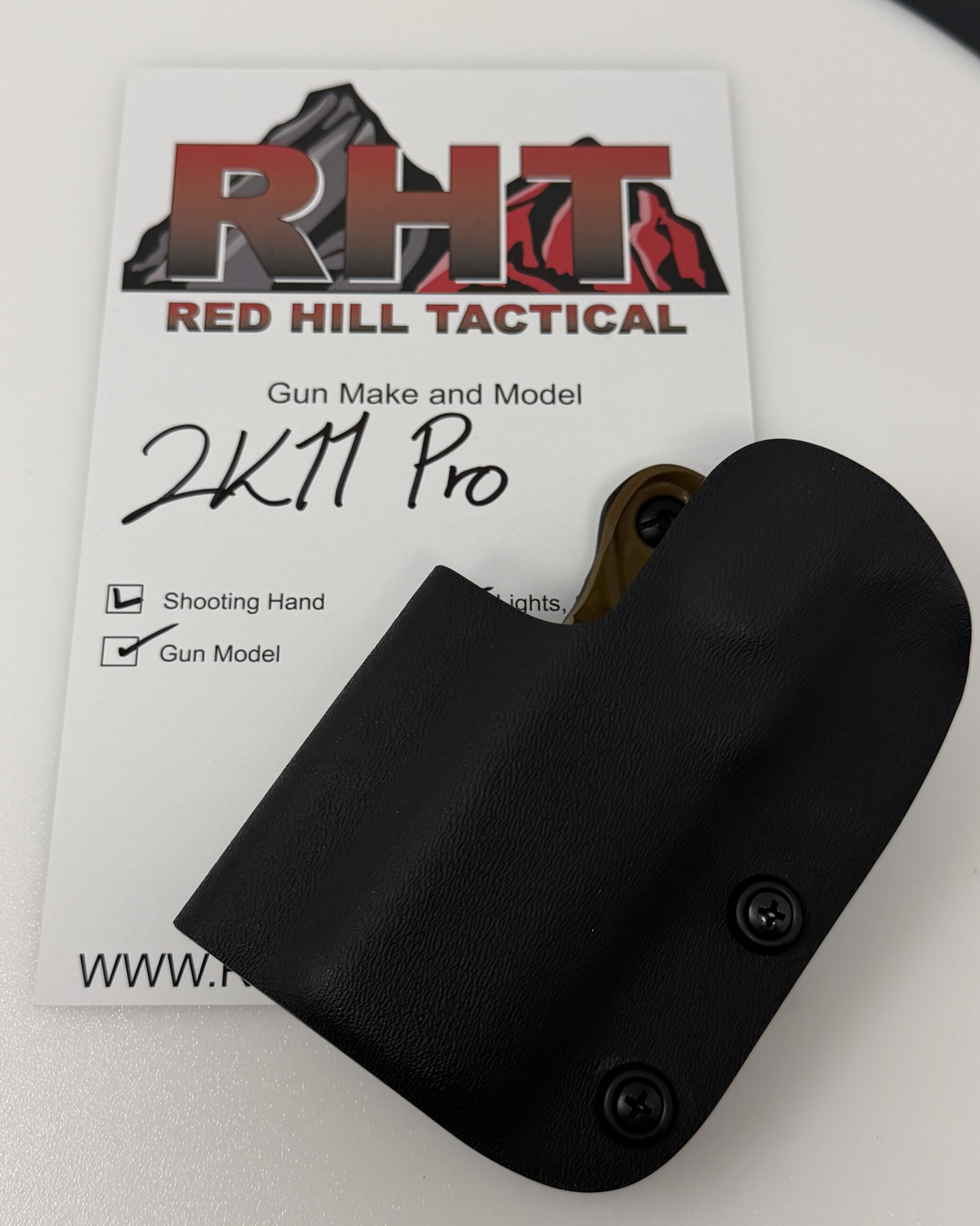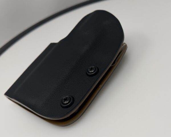 This is the top of the line double layer Red Hill Tactical Kimber 2K11 Pro holster in a black and coyote brown color scheme as used by many shooters around the country. The design stemmed from several top tier shooters sitting around in 2014 with a low cut single layer holster. We were not happy with the movement and flex. One of them said “Hey Bob, add a second layer”. The very next day the RHT double layer holster was born and always proudly Made in the USA. It is available only in the tried and true double layer configuration. This features two layers of .08 thick Kydex to add a great deal of structure to your holster. The extra rigidity supports the low cut that we use, as well as reduces the flex and bounce that happens when you cut this much out of a single layer of Kydex.