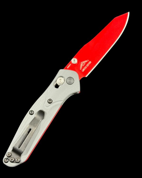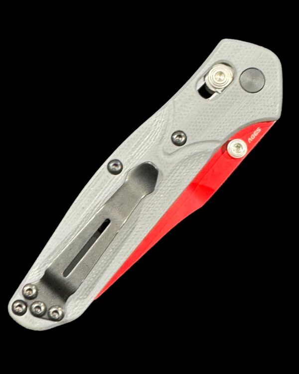Limited Edition Red Reverse Tanto CPM-s90v with Gray G10 Scales. This knife stands out from the crowd with the look unlike most knives you pick up.