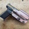 It is available only in the tried and true double layer configuration. This features two layers of .08 thick Kydex to add a great deal of structure to your holster. The extra rigidity supports the low cut that we use, as well as reduces the flex and bounce that happens when you cut this much out of a single layer of Kydex. In addition to the stability, it gives you the ability to further add to the custom look of your rig. We feature everything from solid colors, carbon fiber look, and many custom camouflage patterns including Kyrptek, Supercam, Hexcam and more.