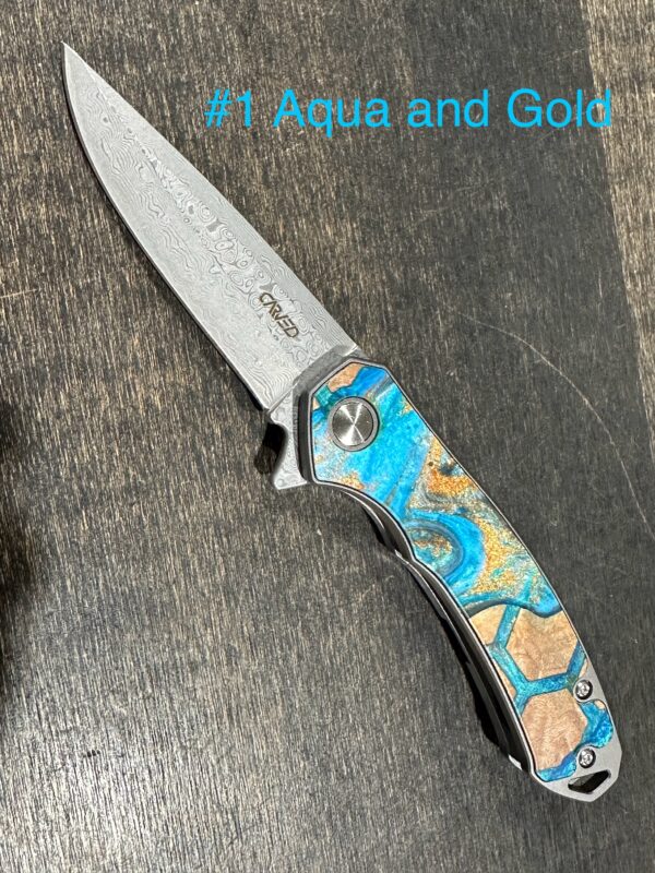 The perfect blend of uniqueness and functionality. A tough but beautiful knife that’s perfect for your everyday carry. Titanium handle, Damascus Stainless Steel blade, artist made inlay.
