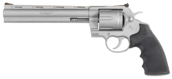 Colt’s popular Snake Gun revolver series gains a new addition with the updated Anaconda. The Anaconda has been fully re-designed to utilize an oversized Python action. Bulked-up with a solid stainless steel frame with a matte finished for strength and durability this DA revolver is worthy of its pedigree. Experience the Linear Leaf Spring Action for a non-stacking smooth-as-glass trigger pull. With recoil-absorbing Hogue grips and adjustable interchangeable sights this .44 Magnum is cool and comfortable from the range to the woods A recessed target crown offers protection and the frame is drilled and tapped for optics mounts making the Anaconda an unstoppable huntsman’s sidearm.