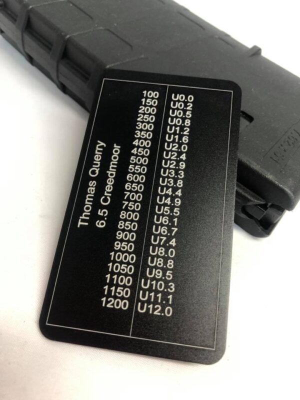 We now have your answer. Custom dope cards to your loads. That’s right. You send us your dope chart that you create for your specific load. We will laser engrave it onto a 1mm thick anodized aluminum business card.