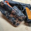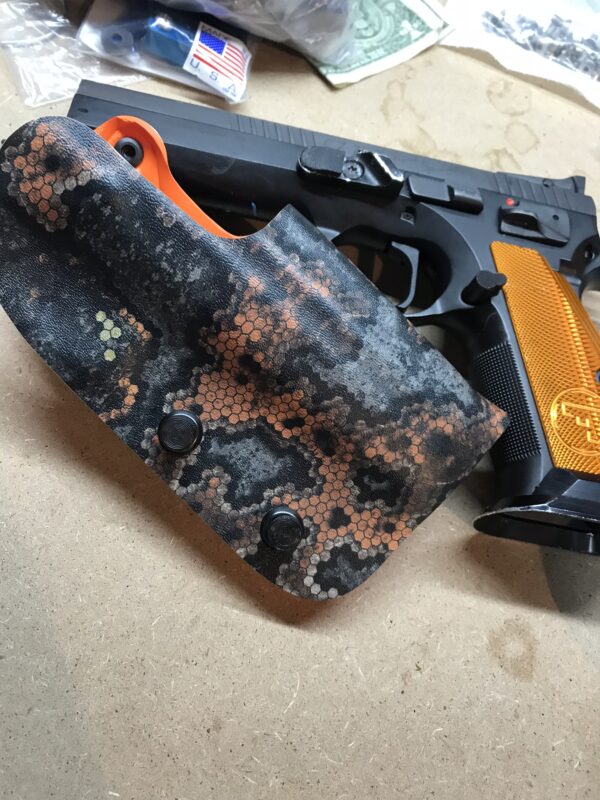 It is available only in the tried and true double layer configuration. This features two layers of .08 thick Kydex to add a great deal of structure to your holster. The extra rigidity supports the low cut that we use, as well as reduces the flex and bounce that happens when you cut this much out of a single layer of Kydex. In addition to the stability, it gives you the ability to further add to the custom look of your rig. We feature everything from solid colors, carbon fiber look, and many custom camouflage patterns including Kyrptek, Supercam, Hexcam and more.