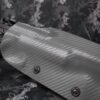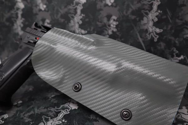 It is available only in the tried and true double layer configuration. This features two layers of .08 thick Kydex to add a great deal of structure to your holster. The extra rigidity supports the low cut that we use, as well as reduces the flex and bounce that happens when you cut this much out of a single layer of Kydex. In addition to the stability, it gives you the ability to further add to the custom look of your rig. We feature everything from solid colors, carbon fiber look, and many custom camouflage patterns including Kryptek, Supercam, Hexcam and more.