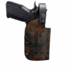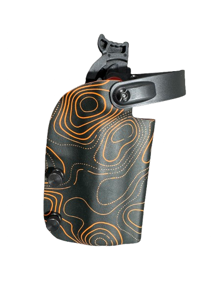 It is available only in the tried and true double layer configuration. This features two layers of .08 thick Kydex to add a great deal of structure to your holster. The extra rigidity supports the low cut that we use, as well as reduces the flex that happens when you push the activation on a single layer of Kydex. In addition to the stability, it gives you the ability to further add to the custom look of your rig. We feature everything from solid colors, carbon fiber look, and many custom camouflage patterns including Kyrptek, Supercam, Hexcam and more.