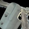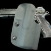It is available only in the tried and true double layer configuration. This features two layers of .08 thick Kydex to add a great deal of structure to your holster. The extra rigidity supports the low cut that we use, as well as reduces the flex and bounce that happens when you cut this much out of a single layer of Kydex. In addition to the stability, it gives you the ability to further add to the custom look of your rig.