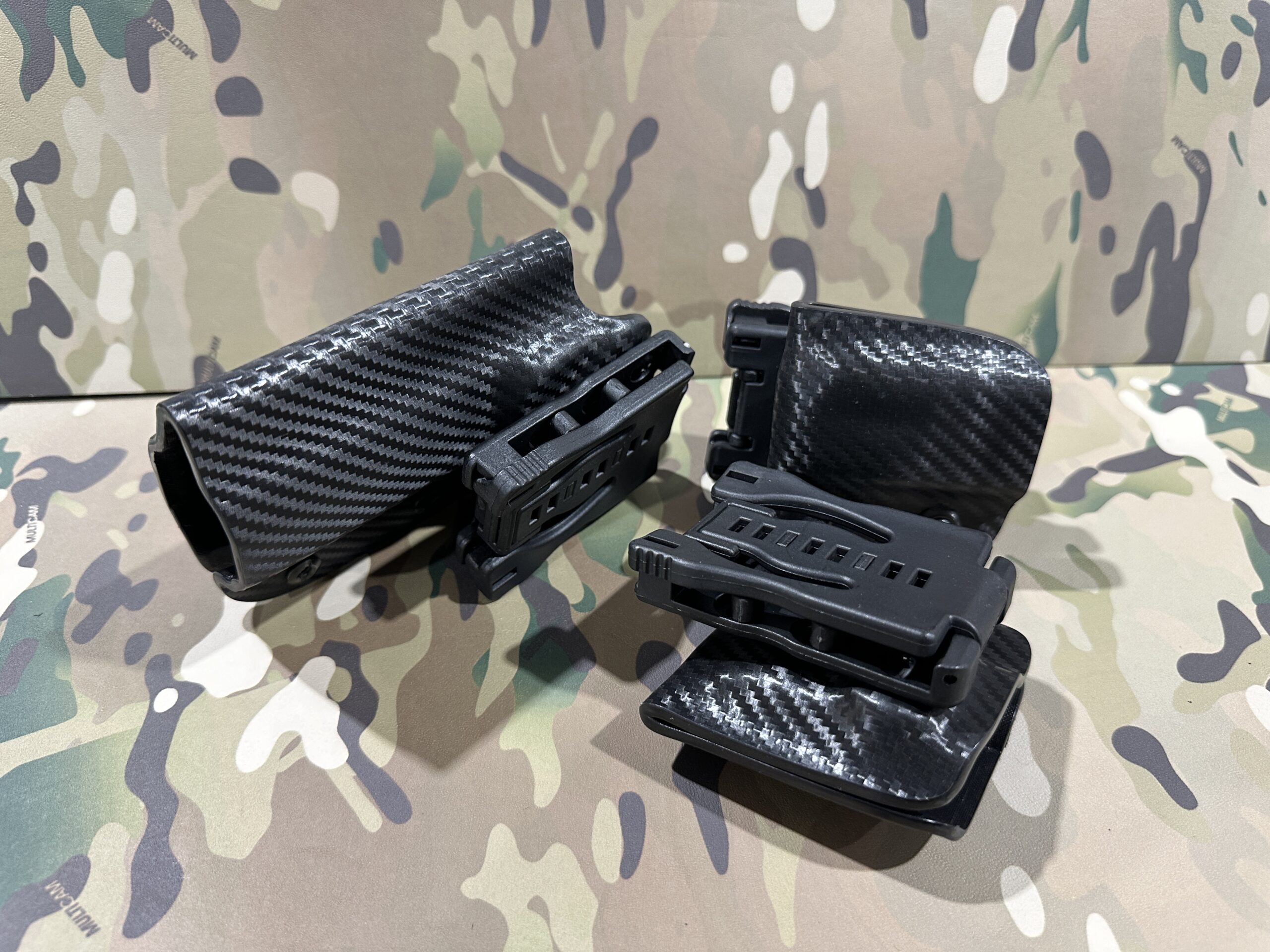 This package comes with a super heavy duty 0.125 Kydex instead of our normal two layers of .08. You get almost the same thickness as our famous double layer, but in one sheet. This allows us to streamline the manufacturing process to reduce some of the production time.