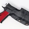 It is available only in the tried and true double layer configuration. This features two layers of .08 thick Kydex to add a great deal of structure to your holster. The extra rigidity supports the low cut that we use, as well as reduces the flex and bounce that happens when you cut this much out of a single layer of Kydex. In addition to the stability, it gives you the ability to further add to the custom look of your rig. We feature everything from solid colors, carbon fiber look, and many custom camouflage patterns including Kryptek, Supercam, Hexcam and more.