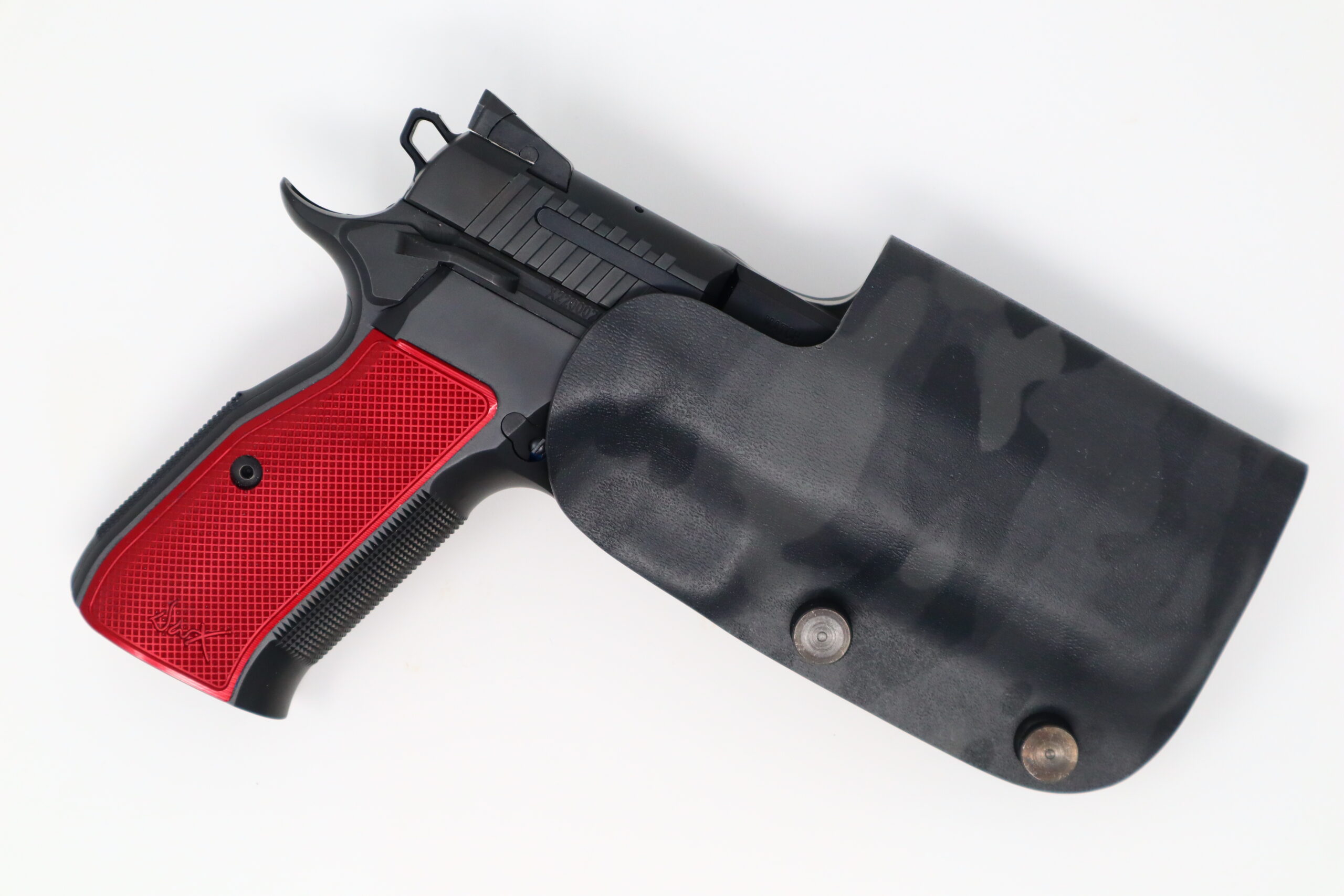 This is the top of the line double layer Red Hill Tactical Dan Wesson DWX holster as used by many shooters around the country. The design stemmed from several top tier shooters sitting around in 2014 with a low cut single layer holster. We were not happy with the movement and flex. One of them said “Hey Bob, add a second layer”. The very next day the RHT double layer holster was born and always proudly Made in the USA. Since then this has been the leading holster in USPSA nationals data for multiple divisions including carry optics and production over many years.