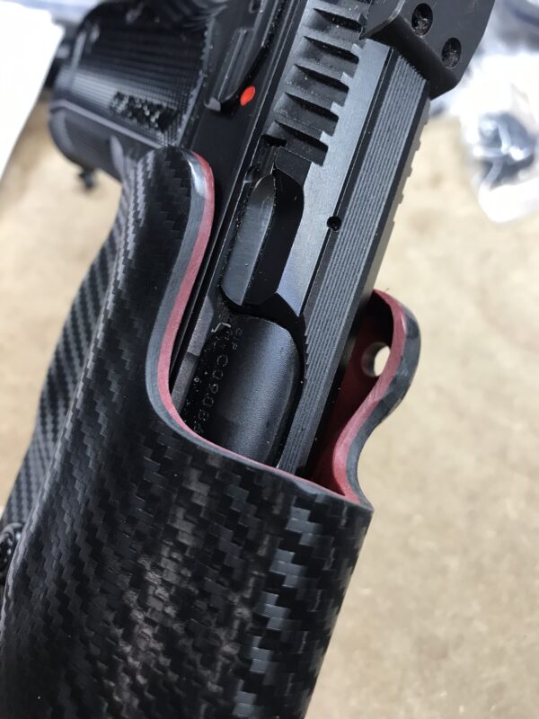 With the Tight and Tuck line we give you the option for a front scoop. You can choose no front cut, which will build the holster with a similar profile to a 3 gun. This will not fit any slide mounted dots. You can choose a mid cut, that is between a 3 gun and competition. This will fit the majority of dots that are compact sized such as Holosun 507k, or Romeo 0. You can then choose the low cut competition style. This will fit most of the slide dots on the market, it may rub on some of the very large dots. We know that the Trijicon RMR will fit this cut, the SRO is tight on some guns.