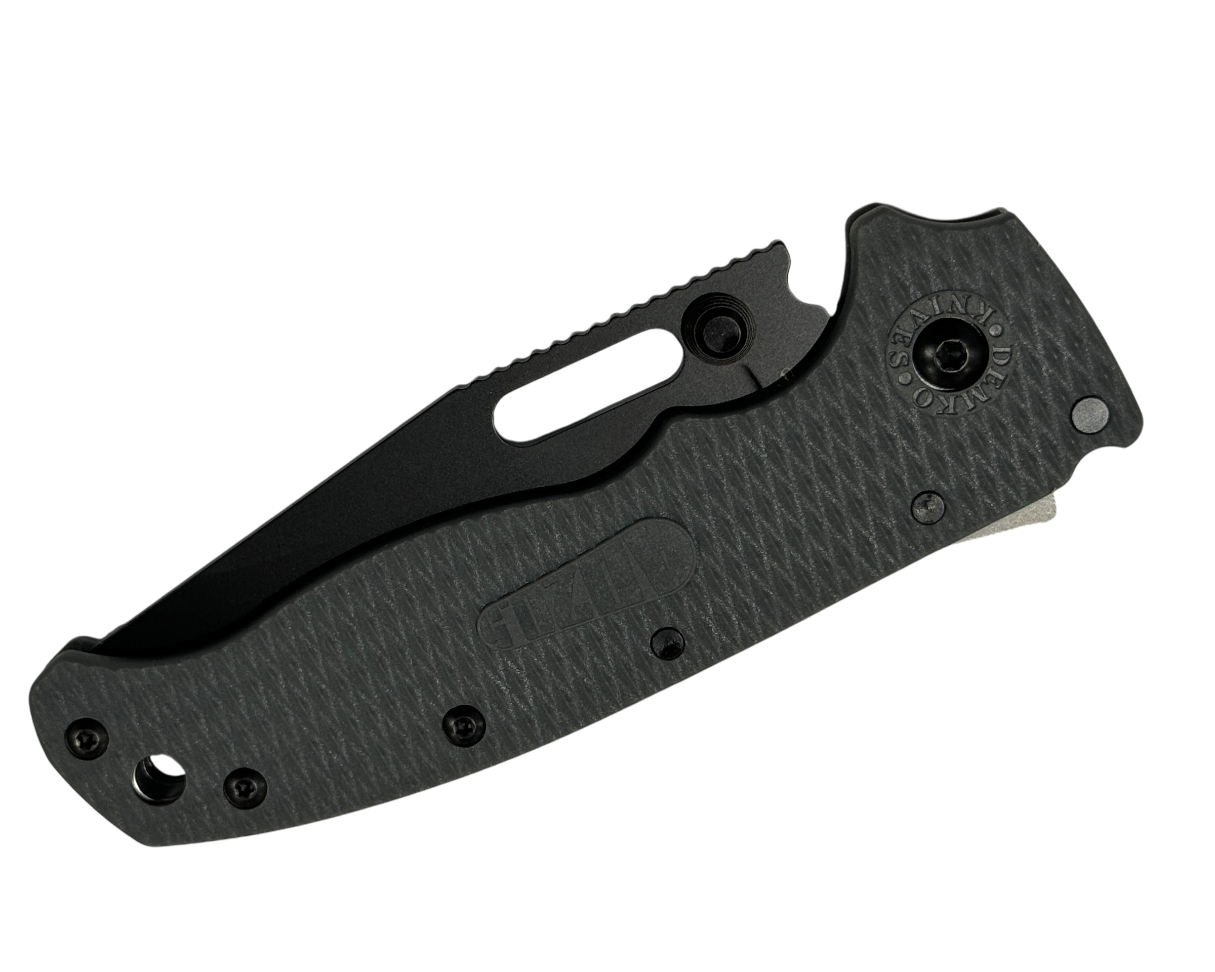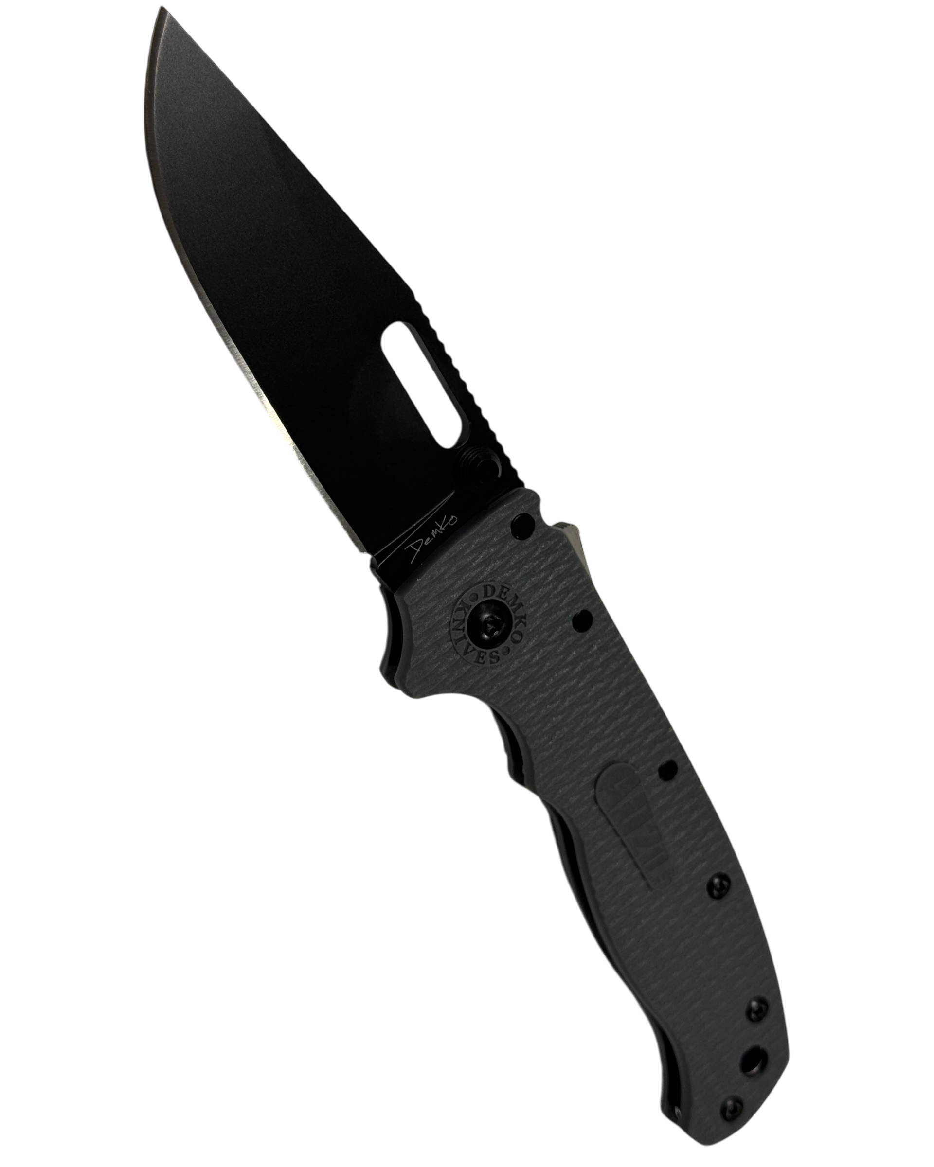 The AD20.5 by Demko Knives features the all-new Shark-Lock™. The Shark Lock mechanism is situated on the spine of the knife and operated with a ramp-like ‘fin.’ Available in two different blade shapes, this knife features ball bearings on the pivot pin, steel liners, and a Grey Grivory handle. The AD20.5 comes standard with a right-handed pocket clip, and also includes a left-handed one.