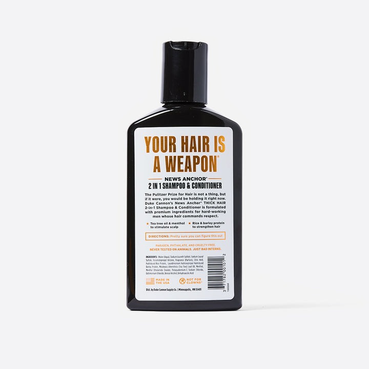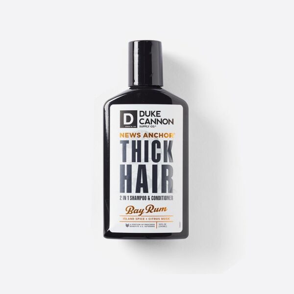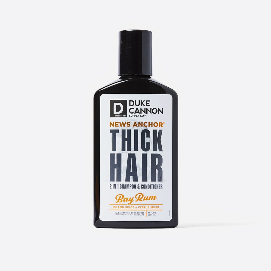 The Pulitzer Prize for Hair is not a thing, but if it were, you would be holding it right now. Duke Cannon’s News Anchor Thick Hair 2-in-1 Shampoo & Conditioner is formulated with premium ingredients including tea tree oil and rice protein to stimulate the scalp and strengthen hair. Our Bay Rum scent features island spices, cedarwood, and citrus musk, temporarily turning your noggin into the best smelling place on Earth.
