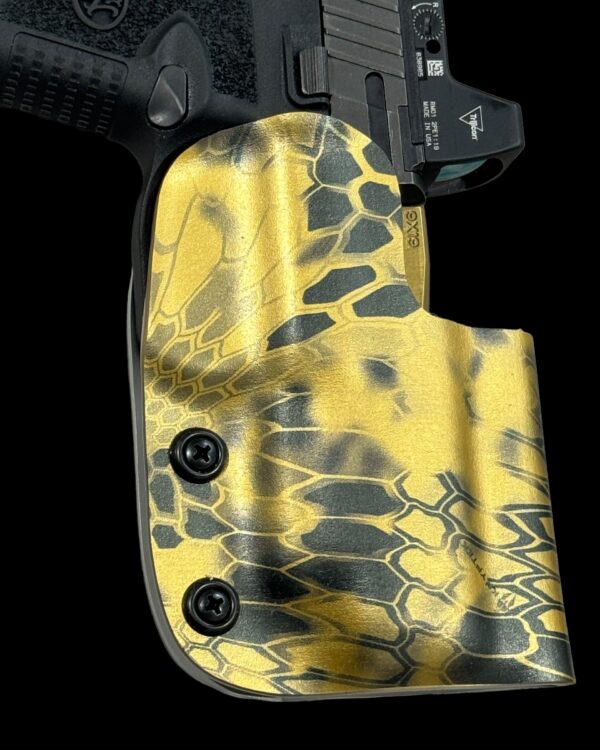 It is available only in the tried and true double layer configuration. This features two layers of .08 thick Kydex to add a great deal of structure to your holster. The extra rigidity supports the low cut that we use, as well as reduces the flex and bounce that happens when you cut this much out of a single layer of Kydex. In addition to the stability, it gives you the ability to further add to the custom look of your rig. We feature everything from solid colors, carbon fiber look, and many custom camouflage patterns including Kryptek, Supercam, Hexcam and more.