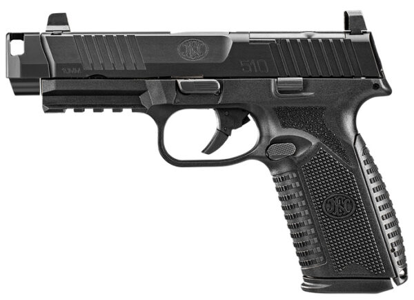 KEY FEATURES – Auto-indexing FN compensator – Reduces muzzle flip-up to 35% – Striker-fired semiautomatic pistol chambered in chambered in 10mm – 4.43-inch cold hammer-forged stainless-steel barrel with recessed target crown – Approximate 6-pound trigger pull – Includes two (2) 15-round magazines; compatible with higher capacity FN 510 magazines – Stainless-steel slide with patented FN Low-Profile Optics-Mounting System; adapters and screws for the direct-mounting of most major optics footprints – Drift-adjustable all-black iron sights that co-witness with installed miniature red dot optic – MIL-STD-1913 accessory mounting rail – Fully ambidextrous magazine release and slide stop lever – Includes two (2) interchangeable backstraps (small and medium) – CALIBER 10mm – MAGAZINE 15rd – WEIGHT 31 oz. – LENGTH 8.3 – BARREL LENGTH 4.43