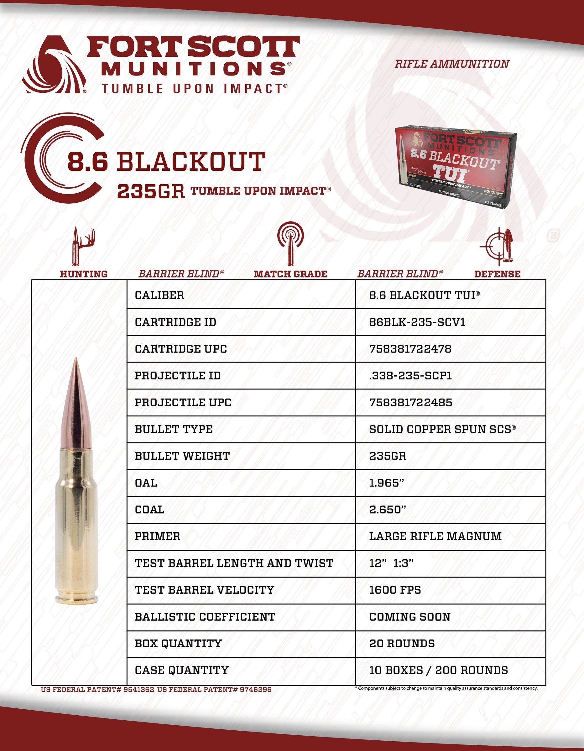 Fort Scott Munitions® presents our 8.6 Blackout ammo with our advanced Tumble Upon Impact® (TUI®) design, offering superior performance and reliability. This multi-patented ammunition features a solid copper spun SCS® bullet, ensuring excellent penetration and devastating internal damage. Our non-lead, solid copper bullets are machined from premium materials using precision CNC lathes, adhering to the highest quality standards.