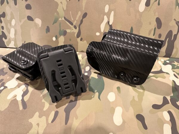 This package comes with a super heavy duty 0.125 Kydex instead of our normal two layers of .08. You get almost the same thickness as our famous double layer, but in one sheet. This allows us to streamline the manufacturing process to reduce some of the production time.
