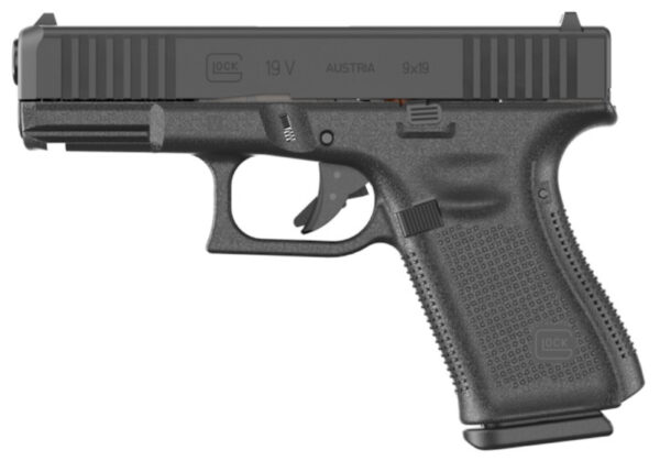 The GLOCK 19 V pistol is versatile for many roles due to the reduced size. The frame design without finger grooves allows the user to customize the grip width to accommodate any hand size by mounting the different back straps. The reversible magazine catch is changeable at user level as well as the ambidextrous slide stop lever to accommodate left and right-handed operators. The G19 V pistol features the GLOCK Marksman Barrel (GMB) nDLC surface finish front serrations an ambidextrous slide stop lever and more. – The SAFE ACTION® System is a fully automatic safety system consisting of three passive independently operating mechanical safeties. All three safeties disengage sequentially as the trigger is pulled and automatically re-engage when the trigger is released. – Caliber 9x19mm – System Safe Action® – Mag. Capacity 10 – Barrel Length 102 mm / 4.02 inch – Weight without magazine 610 g / 21.52 oz – Weight with empty magazine 670 g / 23.63 oz – Weight with loaded magazine 855 g / 30.16 oz – Trigger Pull 26 N