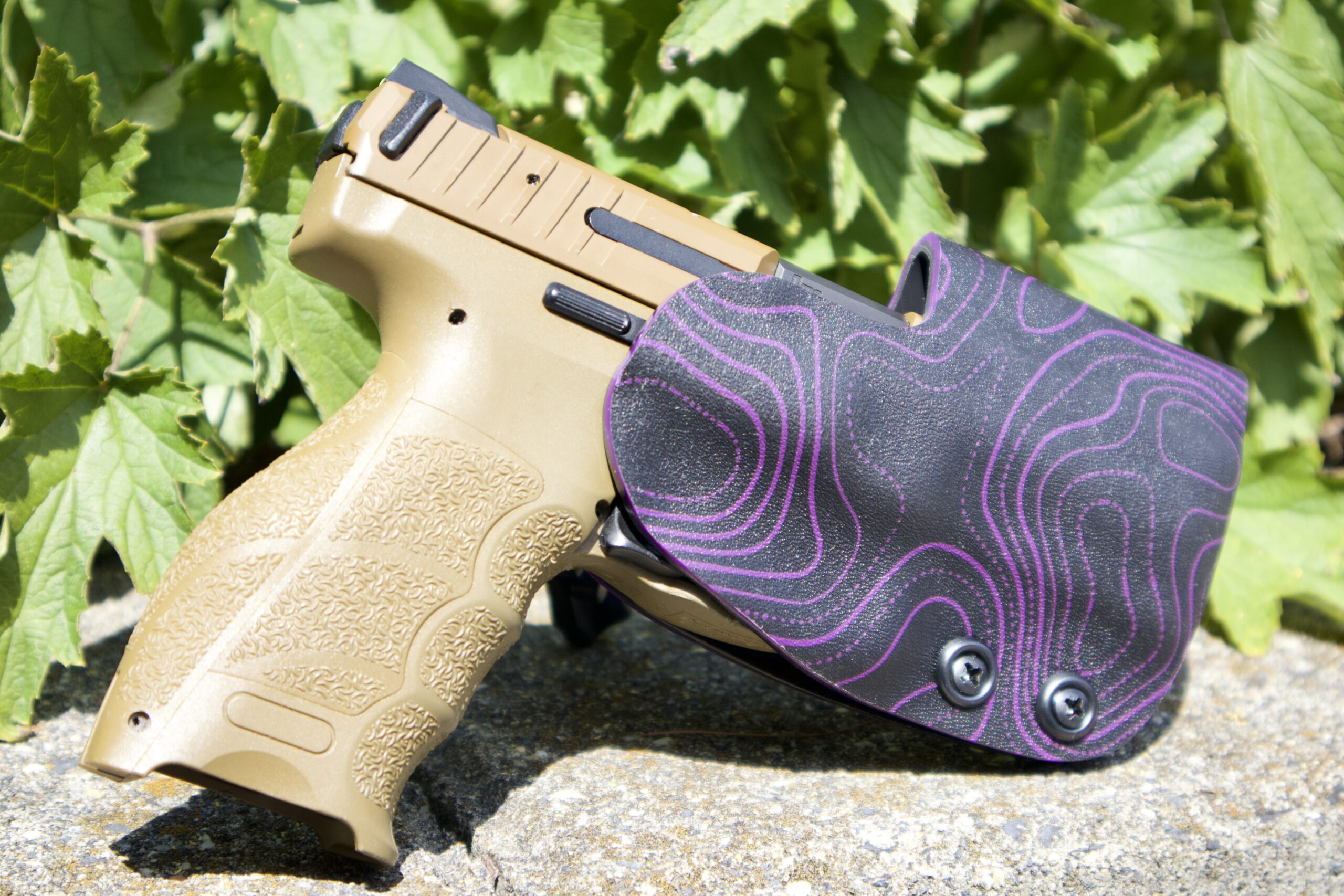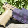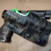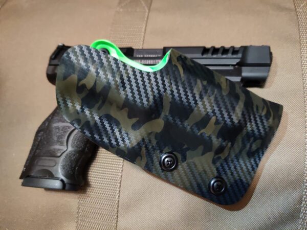 It is available only in the tried and true double layer configuration. This features two layers of .08 thick Kydex to add a great deal of structure to your holster. The extra rigidity supports the low cut that we use, as well as reduces the flex and bounce that happens when you cut this much out of a single layer of Kydex. In addition to the stability, it gives you the ability to further add to the custom look of your rig. We feature everything from solid colors, carbon fiber look, and many custom camouflage patterns including Kyrptek, Supercam, Hexcam and more.