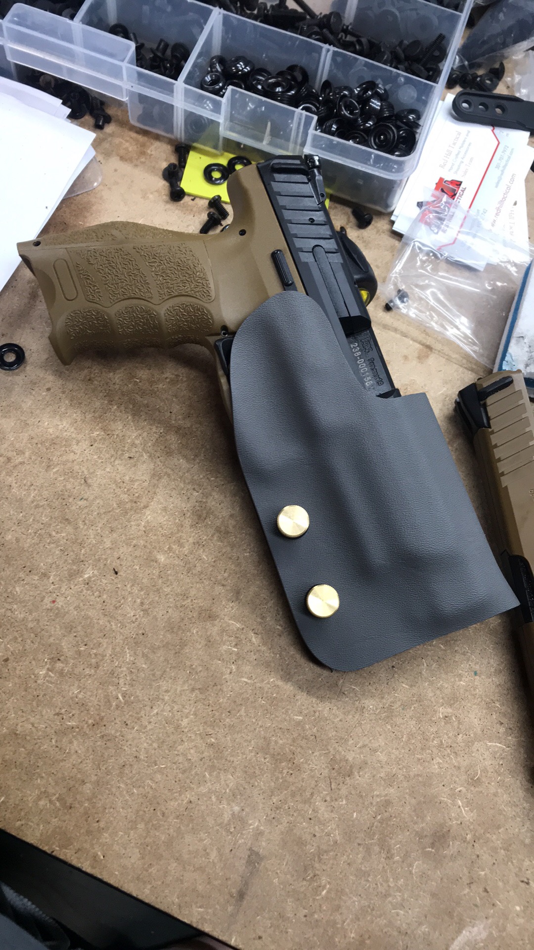 This is the top of the line double layer Red Hill Tactical H & K holster as used by many shooters around the country. The design stemmed from several top tier shooters sitting around in 2014 with a low cut single layer holster. We were not happy with the movement and flex. One of them said “Hey Bob, add a second layer”. The very next day the RHT double layer holster was born and always proudly Made in the USA. Since then this has been the leading holster in USPSA nationals data for multiple divisions including carry optics and production over many years.
