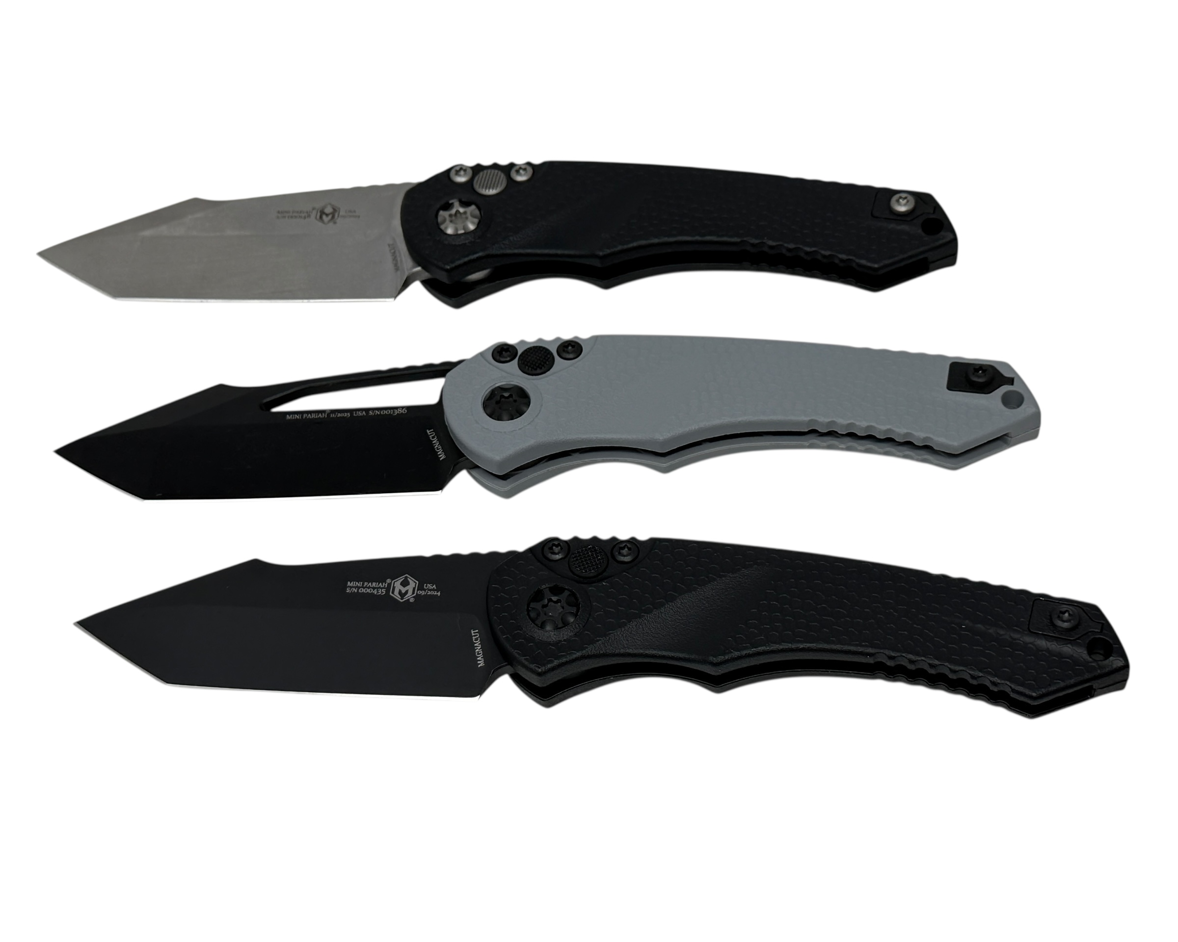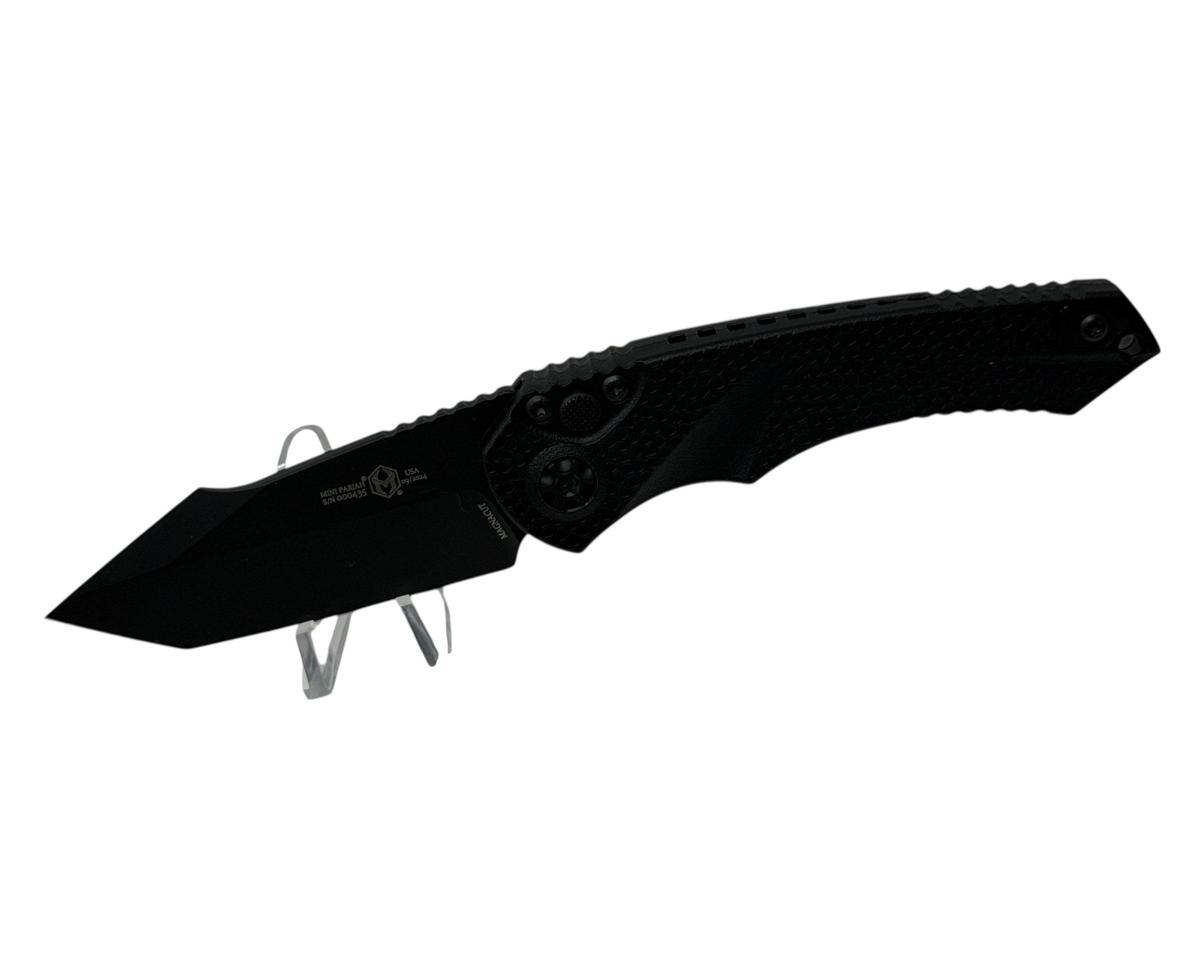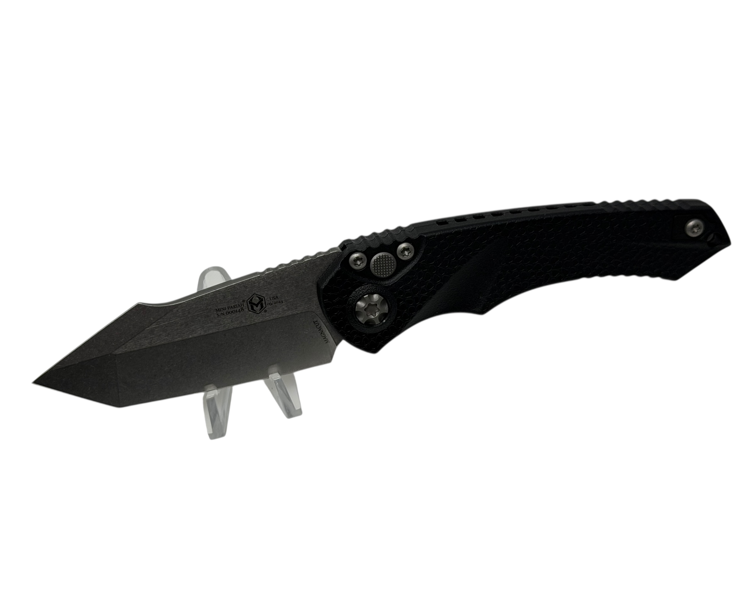 NEW Mini Pariah! Today there will be 4 configurations but there are more to come for sure. This knife is designed to be a lot more thank your average entry level knife! It will feature a Magnacut blade, all hardened stainless steel hardware, ceramic ball bearing action, Gator grip polymer chassis, ambidextrous pocket clip, and available in Tanto Or Single Edge blades AND in AUTO or Manual and completely MADE in AMERICA with Heretics Lifetime Warranty!