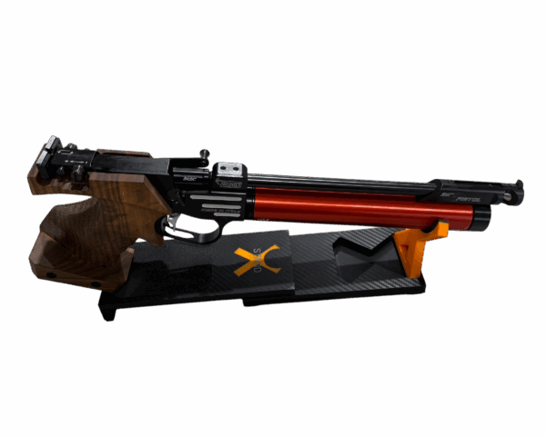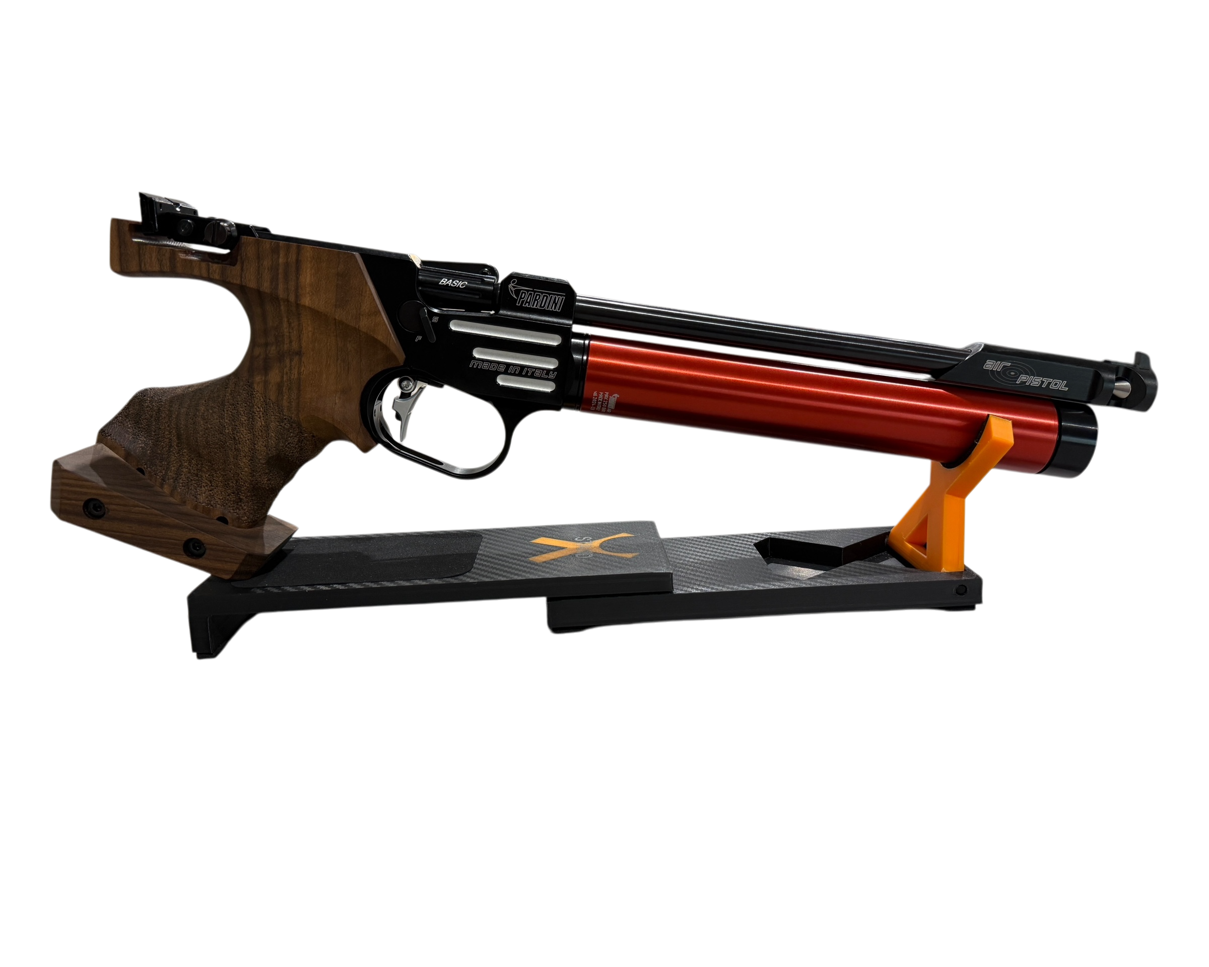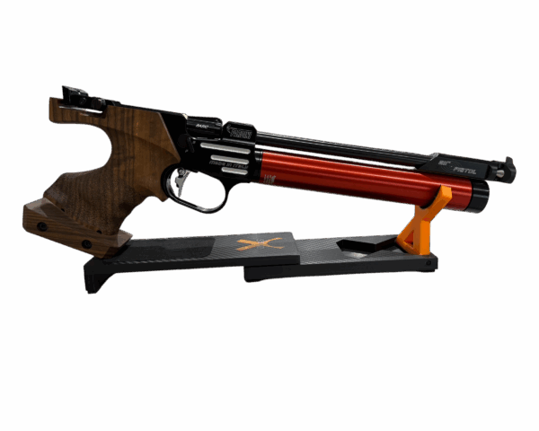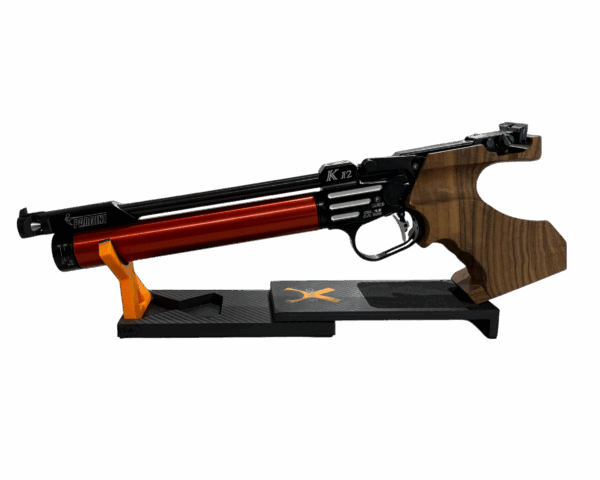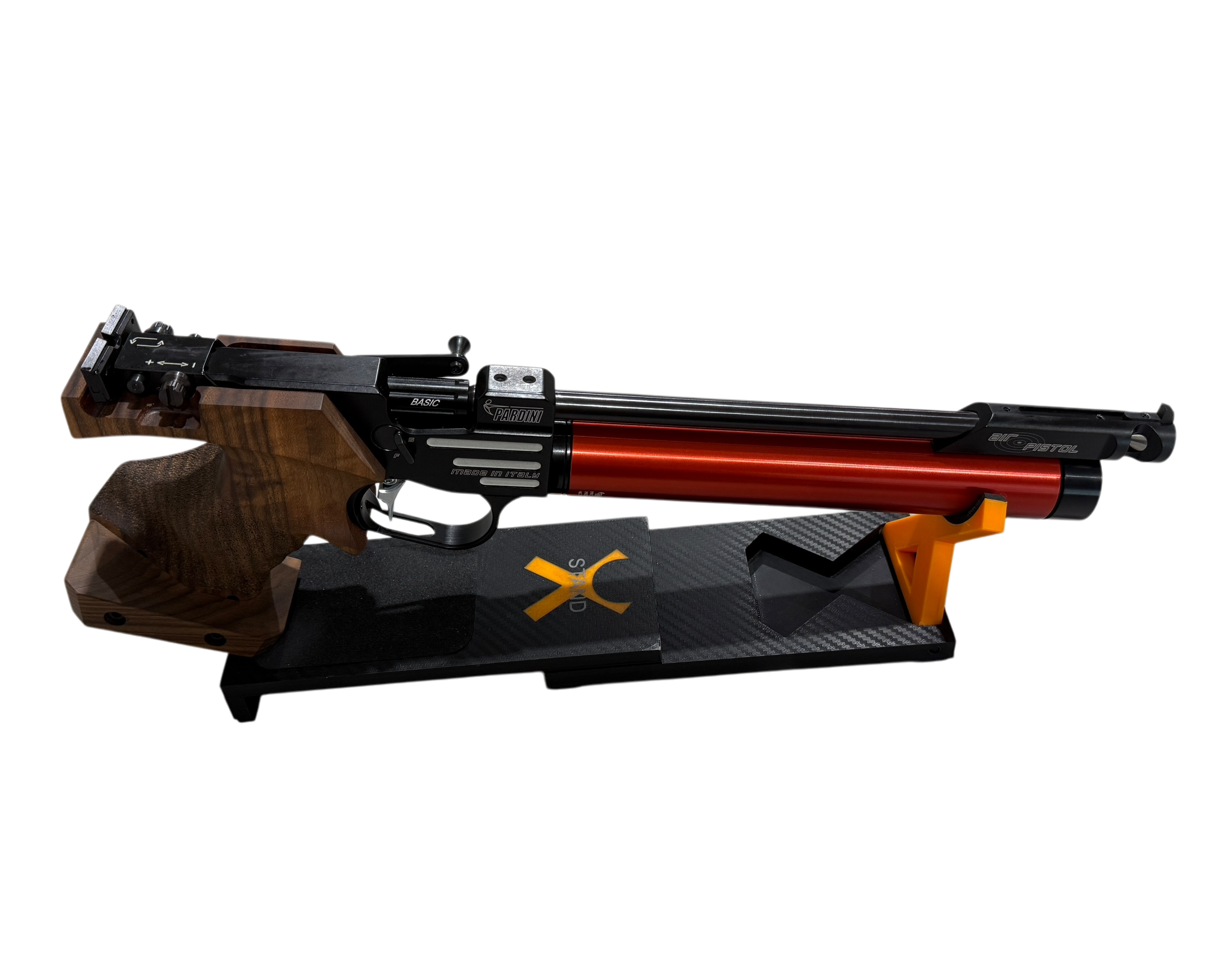 Introduced in 2012, single shot pistol 4.5mm (.177) caliber compressed air. Detachable air cylinder up to 250 bars. Precise and reliable pressure gauge for immediate and completely safe reading of the air pressure in the cylinder. Innovative shot recoil elimination system, located in the bolt (PARDINI patented). New two stage trigger mechanism, completely adjustable, with easyily accessible switch for dry fire.
