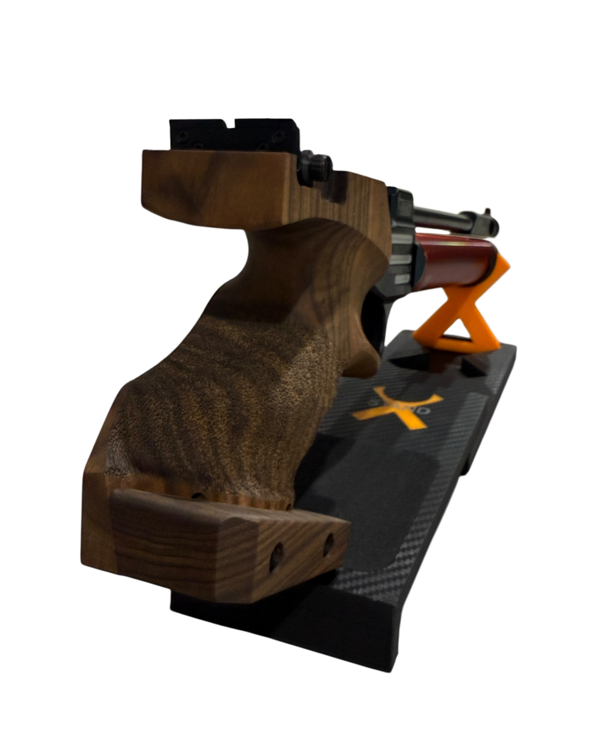 Wide choice of interchangeable front sights. Anatomical walnut grip, available in XS, S, M, and L for right hand and M and L for let hand shooters. Option of factory custom grips.