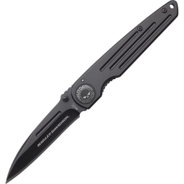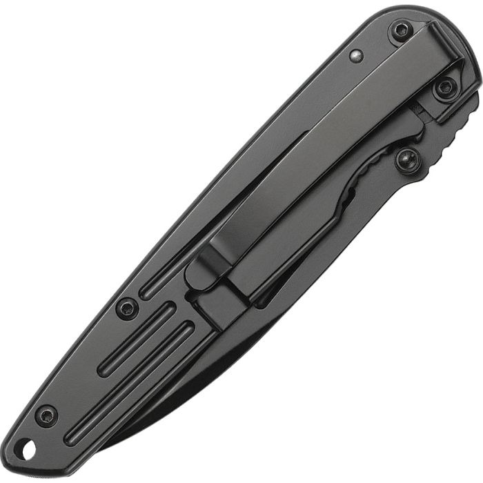 3.25. 4.5″ (11.43cm) closed. Black finish stainless blade. Black grooved stainless handle. Thumb stud. Blade etching. Inlay shield. Lanyard hole. Pocket clip.