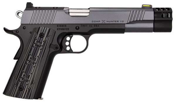 The COMP X Hunter is Kimber’s first production compensated 1911. This new Kimber is chambered in 10mm and features a patent pending compensator and a toolless plunger which makes removal and cleaning easy. This new single stack pistol holds 8 rounds and is designed to be the first in a limited group of dedicated 10mm hunting pistols for modern pistol hunters looking to carry afield or at the range. – Each model is optics ready and works with Kimber’s optic plate mounting system and comes standard with a gray and black KimPro Finish and G-10 Grips – Specifications – Height (inches) 90° from barrel: 5.25 – Weight (ounces) with empty magazine: 40.25 – Length (inches):9.7 – Magazine capacity: 8 – Recoil spring (pounds): 16 – Toolless plunger – Patent-pending compensator – Frame – Material: Stainless steel – Finish: KimPro®II Black – Width (inches): 1.28 – Slide – Material: Stainless steel – Finish: KimPro®II gray – Front and rear serrations – Custom Engraving – Barrel – Length (inches): 5 – Material: Stainless steel – Twist rate (left hand): 16 – Sights – Rear: Optic cover plate with built in rear sight – Front: Green fiber-optic – Grips – VZ Bawidamann Ragnarök black gray G-10 grips – Trigger – Premium Aluminum – Factory setting (approximate pounds): 4-5