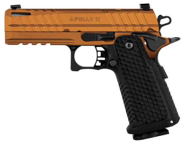 The Apollo 11 Compact 9mm Pistol offers the same exceptional blend of style and performance as its full-size counterpart tailored for those seeking a more compact and maneuverable firearm. This version features a 4.15-inch barrel making it an ideal choice for concealed carry or for users who prefer a more compact profile without sacrificing the superior functionality of the Apollo series. Despite its reduced size the compact model maintains a robust double-stack magazine capacity of 17+1 rounds of 9mm ensuring that firepower is not compromised. – Engineered with precision the Apollo 11 Compact retains the hallmark features of its larger version. It boasts a heat-treated 416 stainless steel slide and a durable 4140 steel frame providing reliability and a sophisticated appearance. The pistol’s shorter barrel is matched with a meticulously tuned trigger system for a crisp consistent pull and a left-hand 1:16 rifling ensuring remarkable accuracy in a smaller package. The compact design enhances concealability and handling while the innovative recoil reduction system and ergonomic grip texture offer comfortable shooting and effective control. Equipped with an RMSc optic cut and accessory rails this compact model offers versatility and customization making it a top choice for both everyday carry and tactical applications.The Apollo 11 Compact is a testament to Live Free Armory’s dedication to quality and innovation backed by a Lifetime Warranty with reliability guaranteed. – Caliber 9x19mm – Weight (No Magazine) 32.61 oz – Slide Width 0.925 – Width (Overall) 1.21 – Slide Length Complete 6.63 – Length (Overall) 7.5 – Height (Overall) 5.46 – Magazine Capacity 17 – Barrel Length 4.15 – Barrel Rifling 1:16 Left Hand – Length of Twist 4.11 – Trigger Pull 3.5lbs – 4.5lbs – Trigger Travel 0.310 – Sight Radius 5.62 – Model Apollo 11 – Optic Cut (Footprint) RMSc