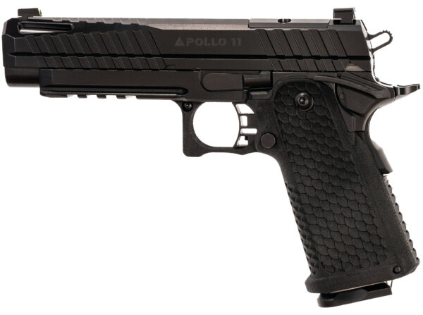 We are pleased to announce that we are now taking pre-orders for the Apollo 11 full size pistol. We are not taking payments at this time. We will be filling orders in the order that they are received. Starting price will be $979 plus S&H and other fees. – Introducing the cutting-edge Apollo 11 9mm Pistol a marvel of firearm engineering that seamlessly blends timeless design with modern innovation to deliver unmatched performance and reliability. Crafted with precision and attention to detail this pistol is the embodiment of form and function. The Apollo 11 pistol boasts a sleek and elegant profile with a heat treated 416 stainless steel slide 4140 steel frame that exudes sophistication. Its streamlined frame available in various colors not only looks stunning but also ensures excellent ergonomics for a comfortable grip and easy handling. This pistol offers a double-stack magazine design allowing for an impressive capacity of up to 17+1 rounds of 9mm ammunition. Whether for self-defense competitive shooting or target practice youll have ample firepower at your disposal. The heart of the Apollo 11 pistol lies in its meticulously engineered components. Its match-grade barrel guarantees exceptional accuracy while the finely tuned trigger system provides a crisp consistent break for precise shot placement. The Apollo 11 features a match grade 4.9 inch bushingless-bull barrel that is honed burnished to an 8-micron finish and rifle cut for unparalleled accuracy. Each component is hand-fitted for optimal performance. With its innovative recoil reduction system and aggressive grip texture this pistol delivers minimal recoil allowing for rapid follow-up shots and improved accuracy. Whether youre a seasoned shooter or a novice youll appreciate the reduced muzzle rise and enhanced control. Personalization is key and the Apollo 11 9mm Pistol offers a range of customization options. Accessory rails enable the attachment of lights lasers and other tactical enhancements. The slide comes standard with an RMSc optic cut to directly mount a sight without cumbersome plates or adapters. Your safety is paramount and this pistol incorporates modern safety features including a grip safety and a robust ambidextrous manual thumb safety for peace of mind while carrying and handling. Engineered to withstand the rigors of extended use the Apollo 11 9mm Pistol is constructed from high-quality materials. Its durable finish resists wear and corrosion ensuring a long service life. This pistol is designed to perform flawlessly even in adverse conditions. Whether youre a professional in the field or a recreational shooter at the range the Apollo 11 pistol adapts to your needs. Its adaptable design makes it suitable for home defense concealed carry or competitive shooting. – The Apollo 11 9mm Pistol is a harmonious blend of classic design and modern technology offering an exquisite combination of style accuracy and guaranteed reliability. With its enhanced capacity precision engineering and customizable features it stands as a testament to the evolution of firearms design and is sure to exceed your expectations. Experience the pinnacle of handgun craftsmanship with the Apollo 11 pistol. – Caliber 9x19mm – Weight (No Magazine) 35.2 oz – Slide Width 0.925 – Width (Overall) 1.21 – Slide Length Complete 7.42 – Length (Overall) 8.41 – Height (Overall) 5.46 – Magazine Capacity 17 – Barrel Length 4.9 – Barrel Rifling 1:16 Left Hand – Length of Twist 4.11 – Trigger Pull 3.5lbs – Trigger Travel 0.310 – Sight Radius 5.92 – Model Apollo 11 – Optic Cut (Footprint) RMSc