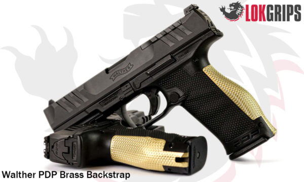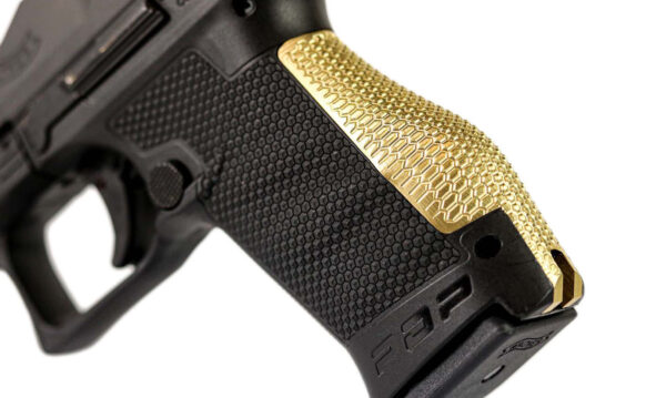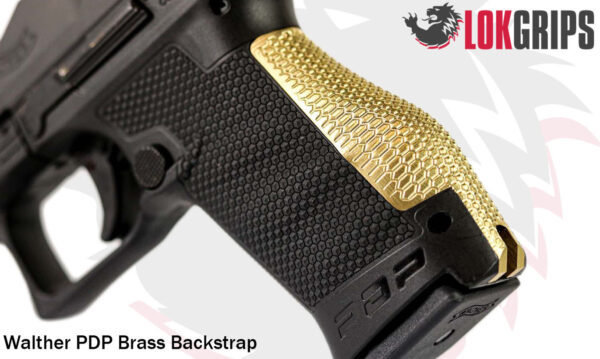Our Brass Backstrap for the Walther PDP is CNC machined from solid brass for added weight and has a very grippy hexagonal texture for increased performance and stability.