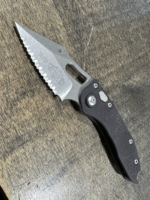 The Microtech Stitch® is a production version of the custom knife collaboration between Marfione Custom Knives® and Borka Blades. This model features a substantial choil and thumb ramp, spear point style blade and a knurled alloy handle with a black finish. Most of our Stitch® Auto knives come fitted with bead blasted hardware (unless DLC or Tactical) and a secure right hand, tip-up carry pocket clip.