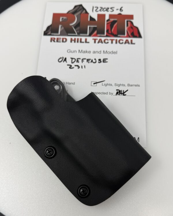 This is the top of the line double layer Red Hill Tactical OA Defense 2311 holster as used by many shooters around the country. The design stemmed from several top tier shooters sitting around in 2014 with a low cut single layer holster. We were not happy with the movement and flex. One of them said “Hey Bob, add a second layer”. The very next day the RHT double layer holster was born and always proudly Made in the USA. Since then this has been the leading holster in USPSA nationals data for multiple divisions including carry optics and production over many years.