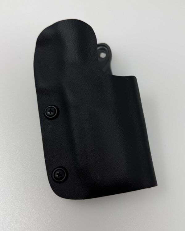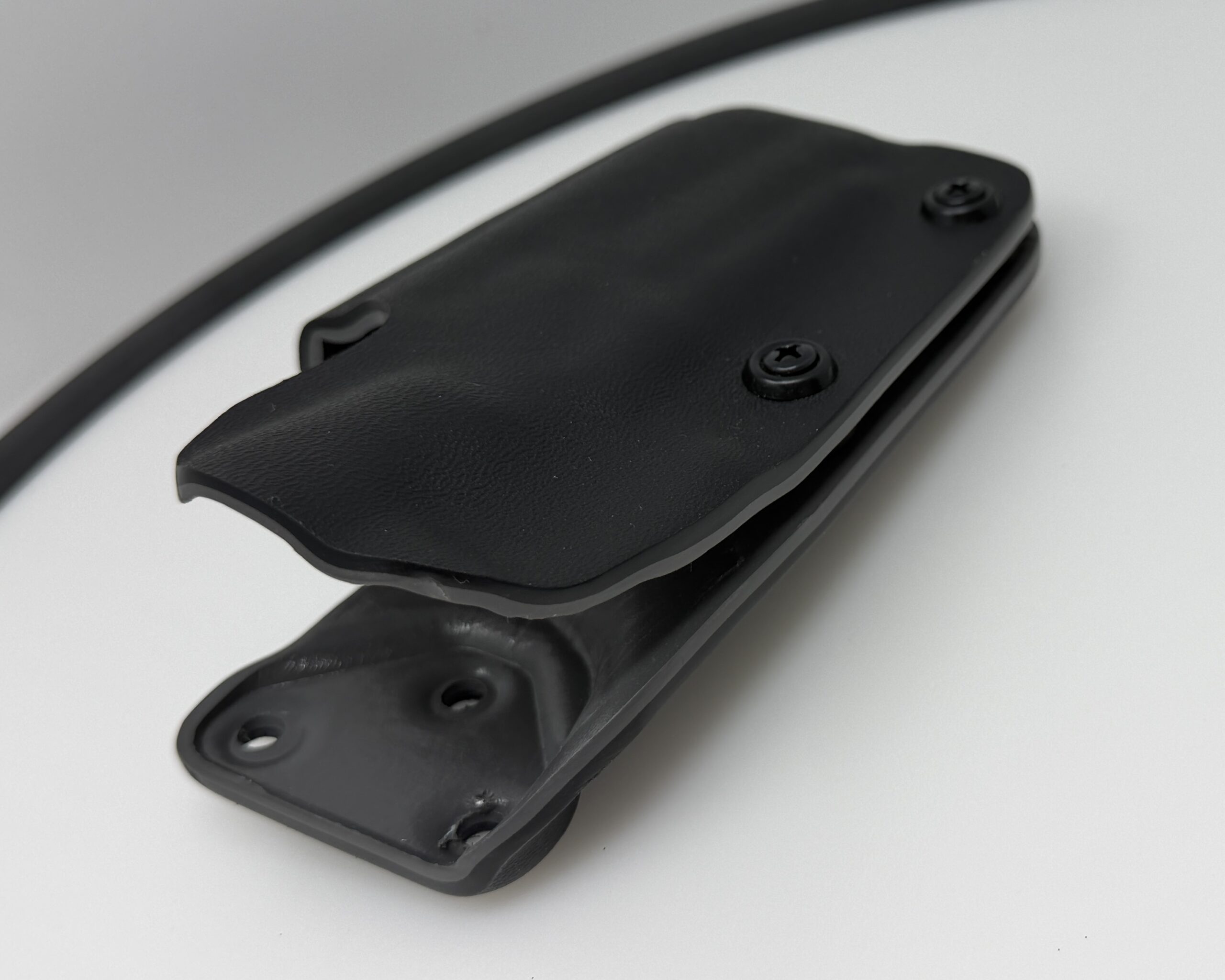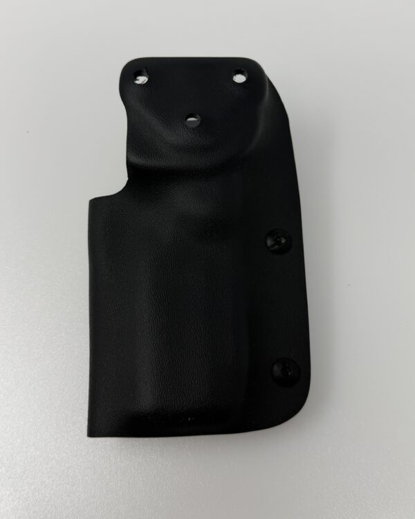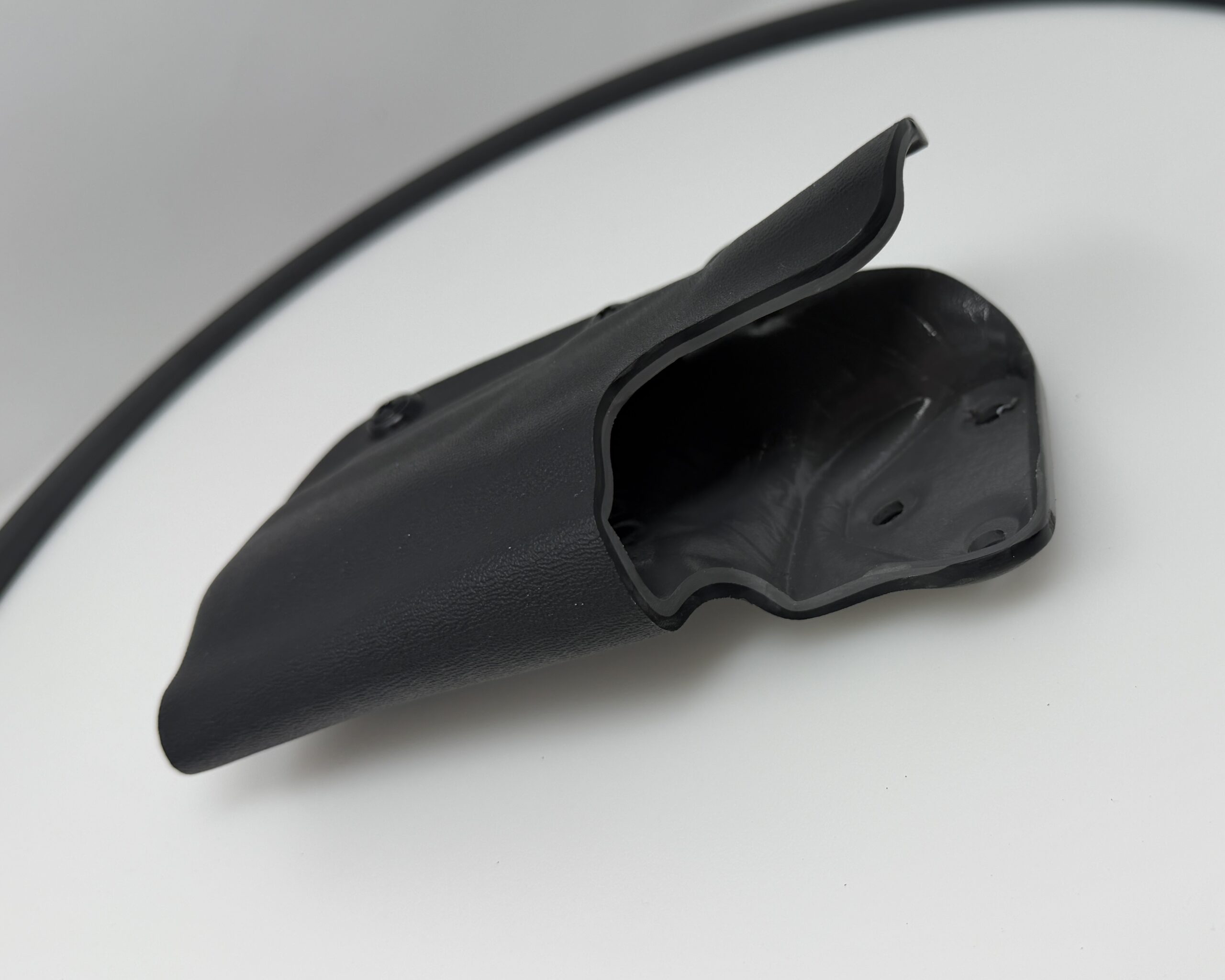 It is available only in the tried and true double layer configuration. This features two layers of .08 thick Kydex to add a great deal of structure to your holster. The extra rigidity supports the low cut that we use, as well as reduces the flex and bounce that happens when you cut this much out of a single layer of Kydex. In addition to the stability, it gives you the ability to further add to the custom look of your rig.