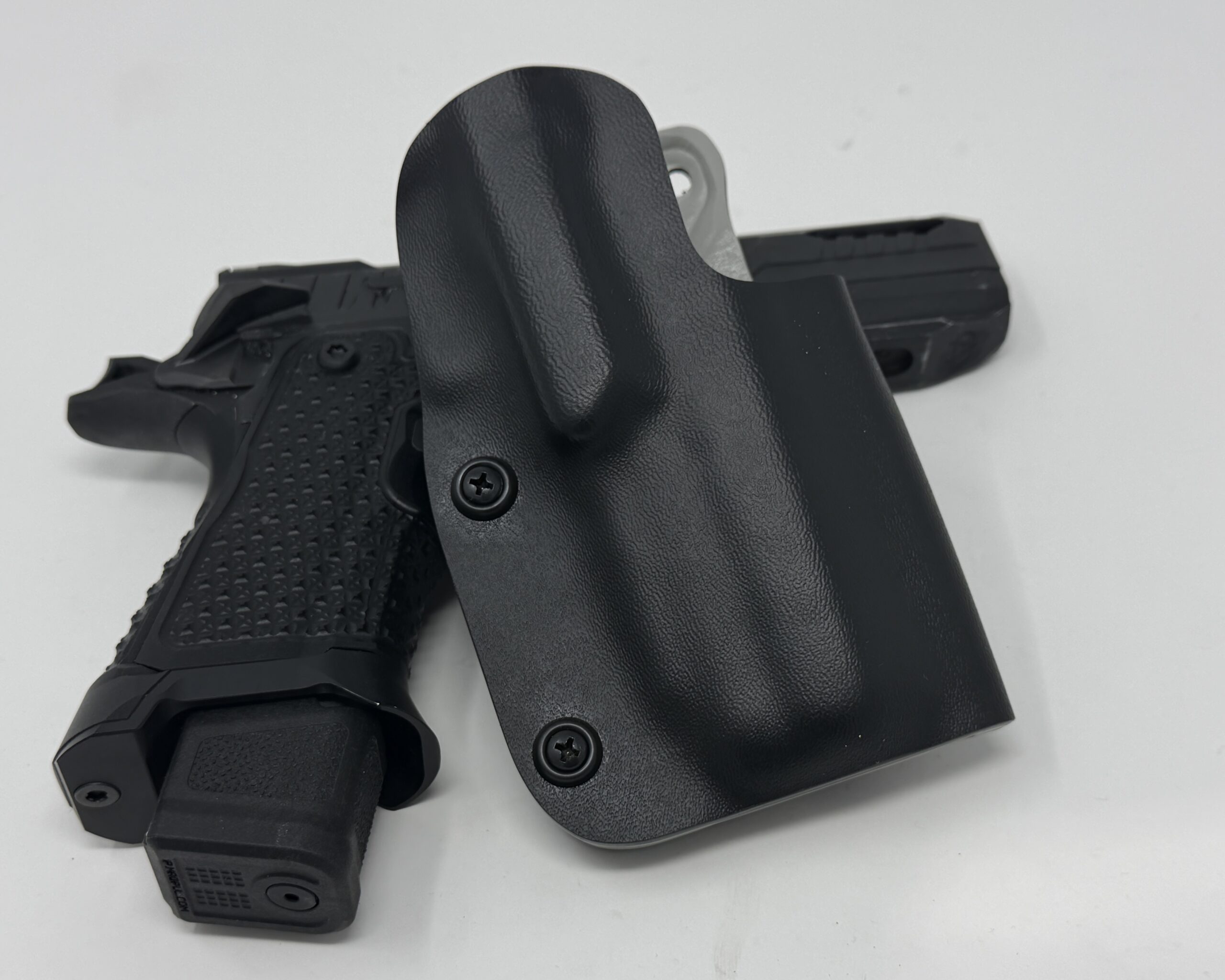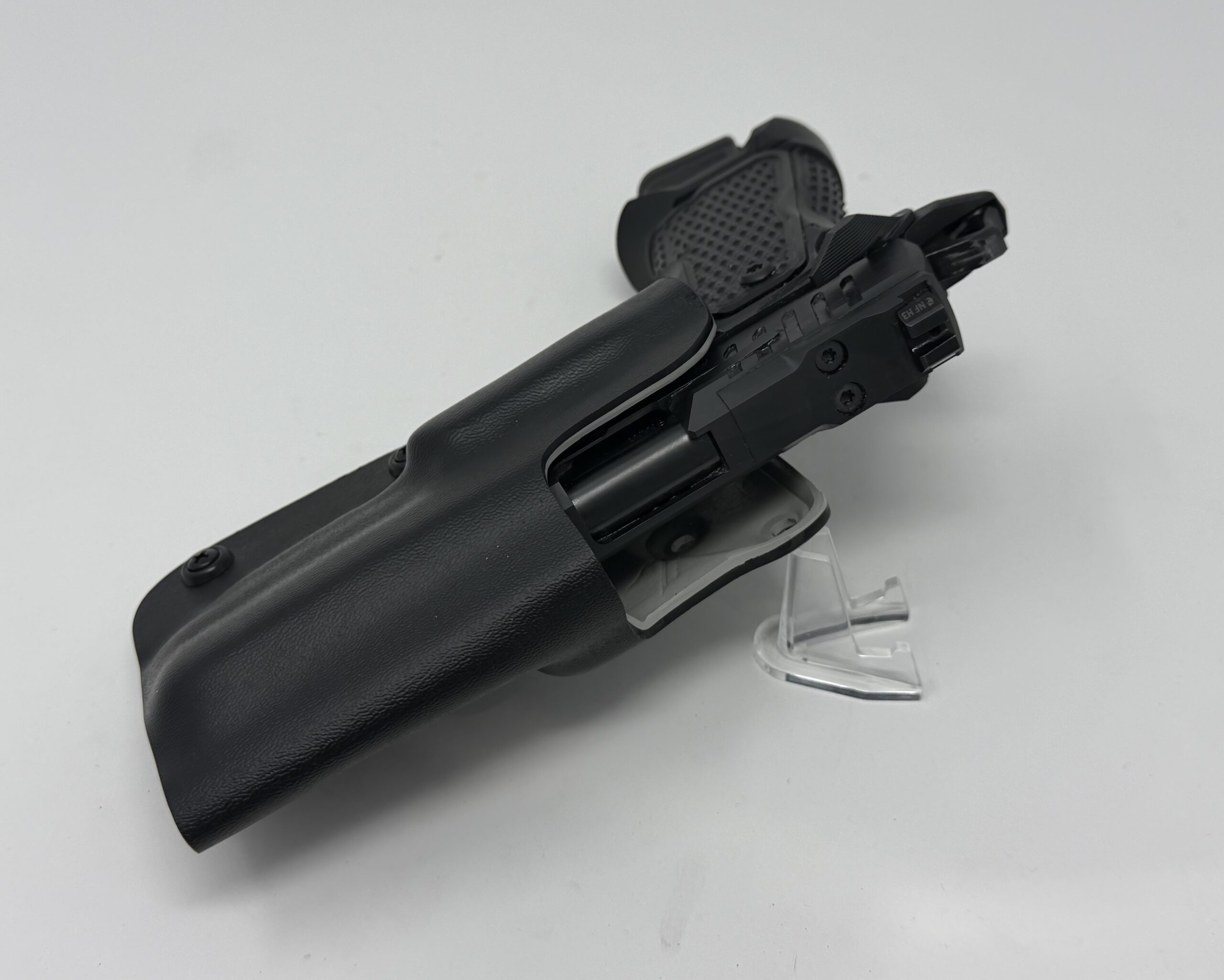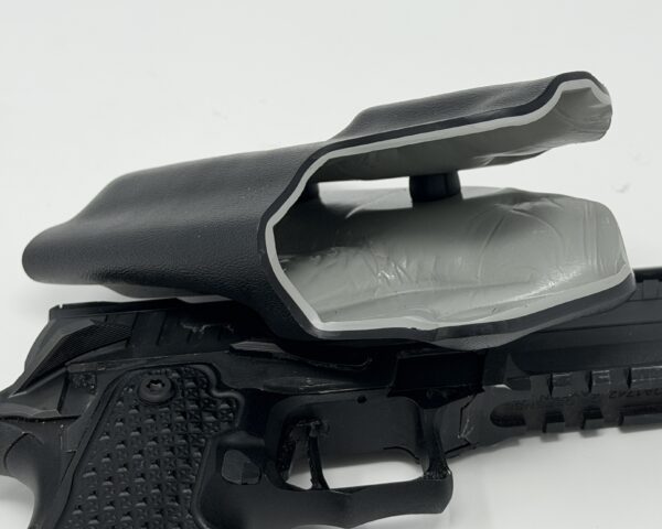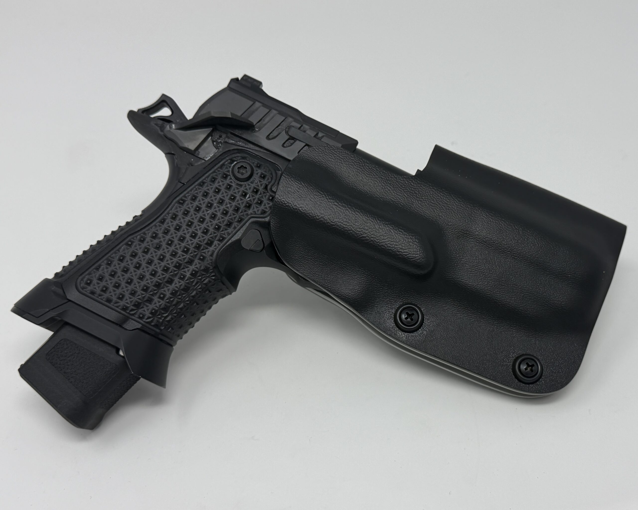 This is the top of the line double layer Red Hill Tactical OA Defense 2311 holster as used by many shooters around the country. The design stemmed from several top tier shooters sitting around in 2014 with a low cut single layer holster. We were not happy with the movement and flex. One of them said “Hey Bob, add a second layer”. The very next day the RHT double layer holster was born and always proudly Made in the USA. Since then this has been the leading holster in USPSA nationals data for multiple divisions including carry optics and production over many years.