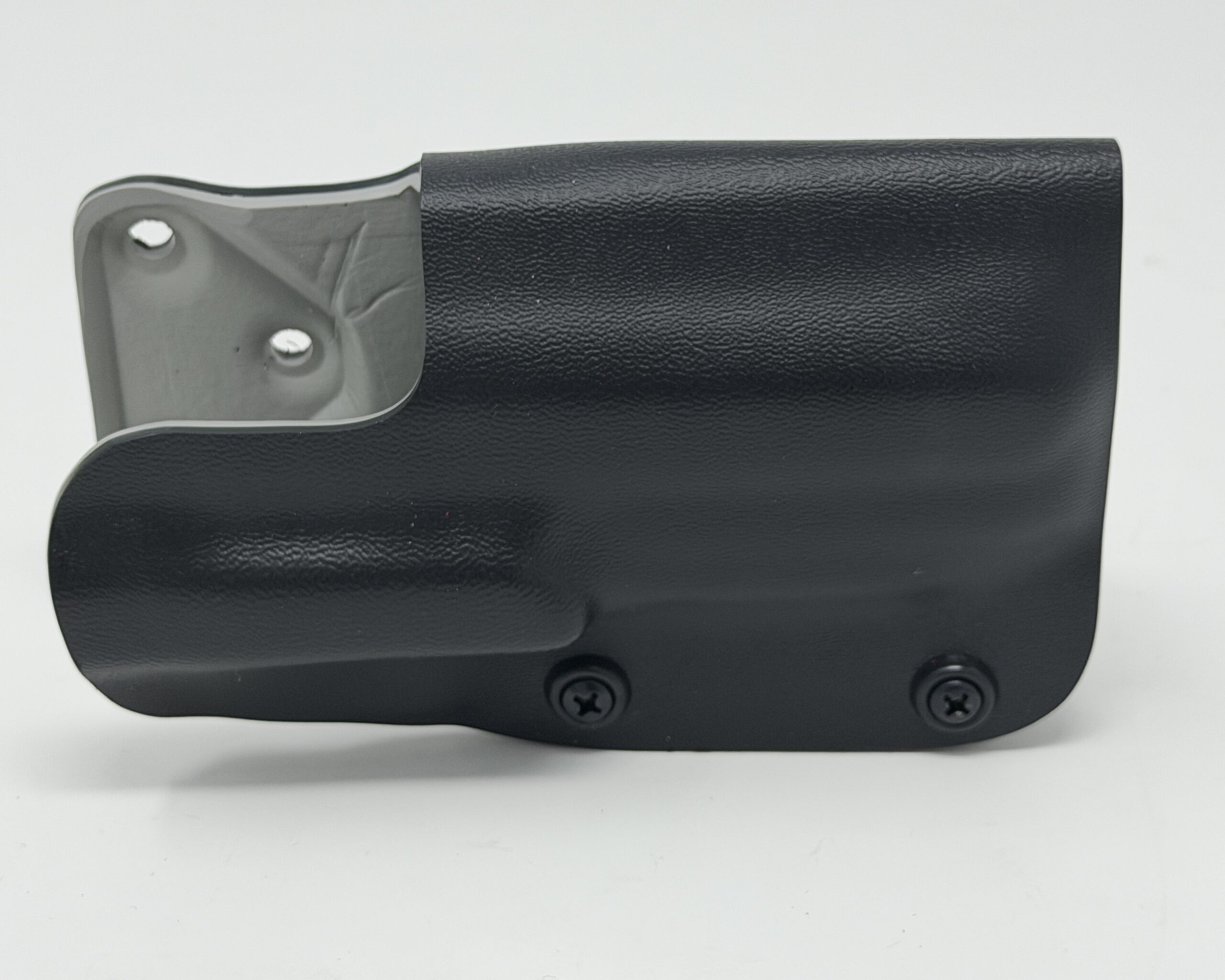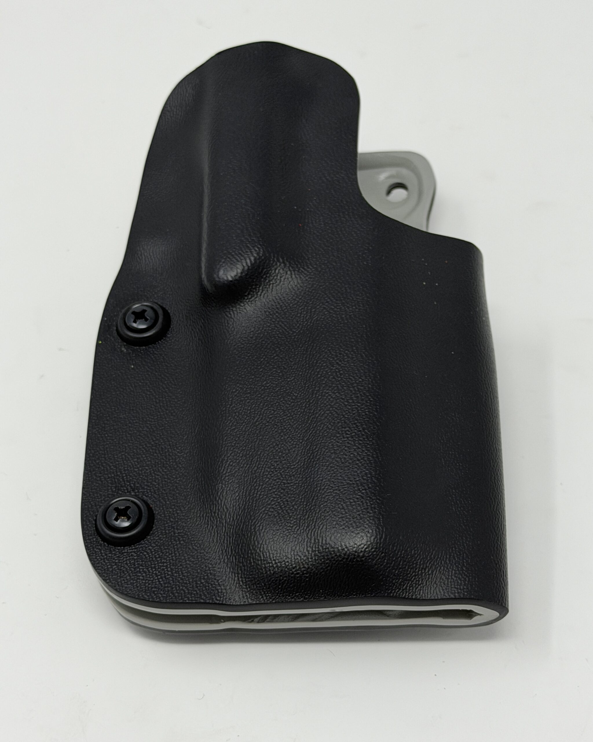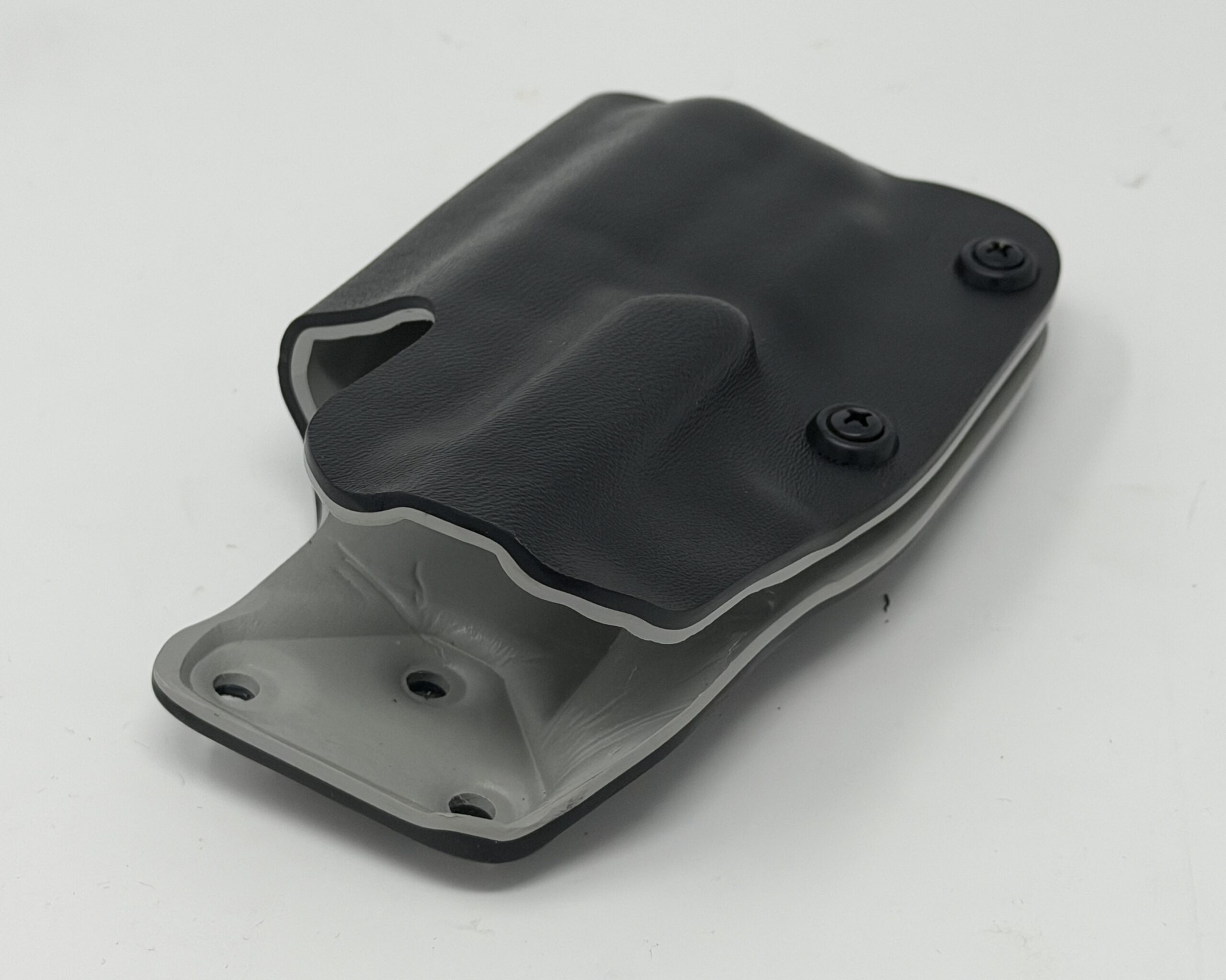 It is available only in the tried and true double layer configuration. This features two layers of .08 thick Kydex to add a great deal of structure to your holster. The extra rigidity supports the low cut that we use, as well as reduces the flex and bounce that happens when you cut this much out of a single layer of Kydex. In addition to the stability, it gives you the ability to further add to the custom look of your rig.