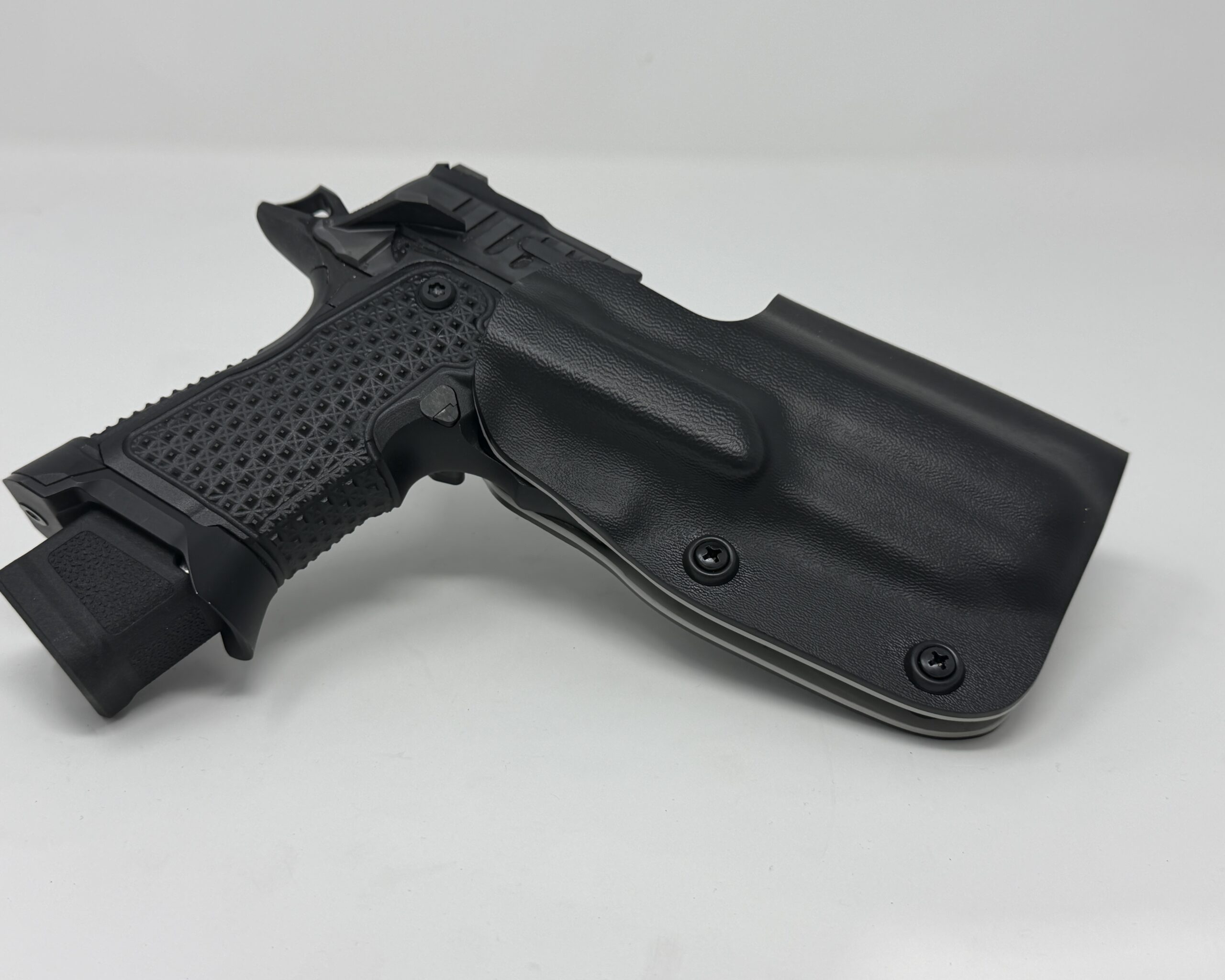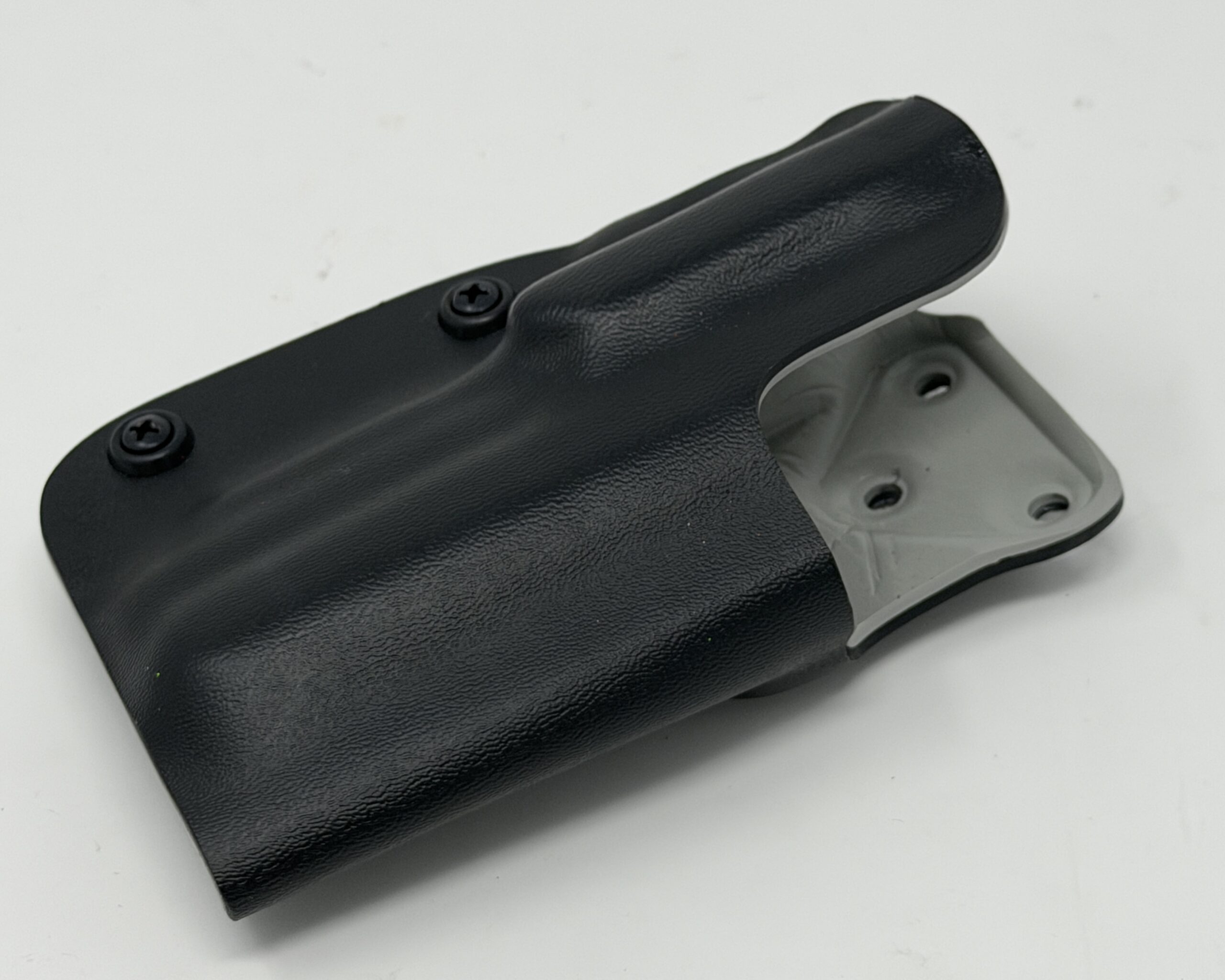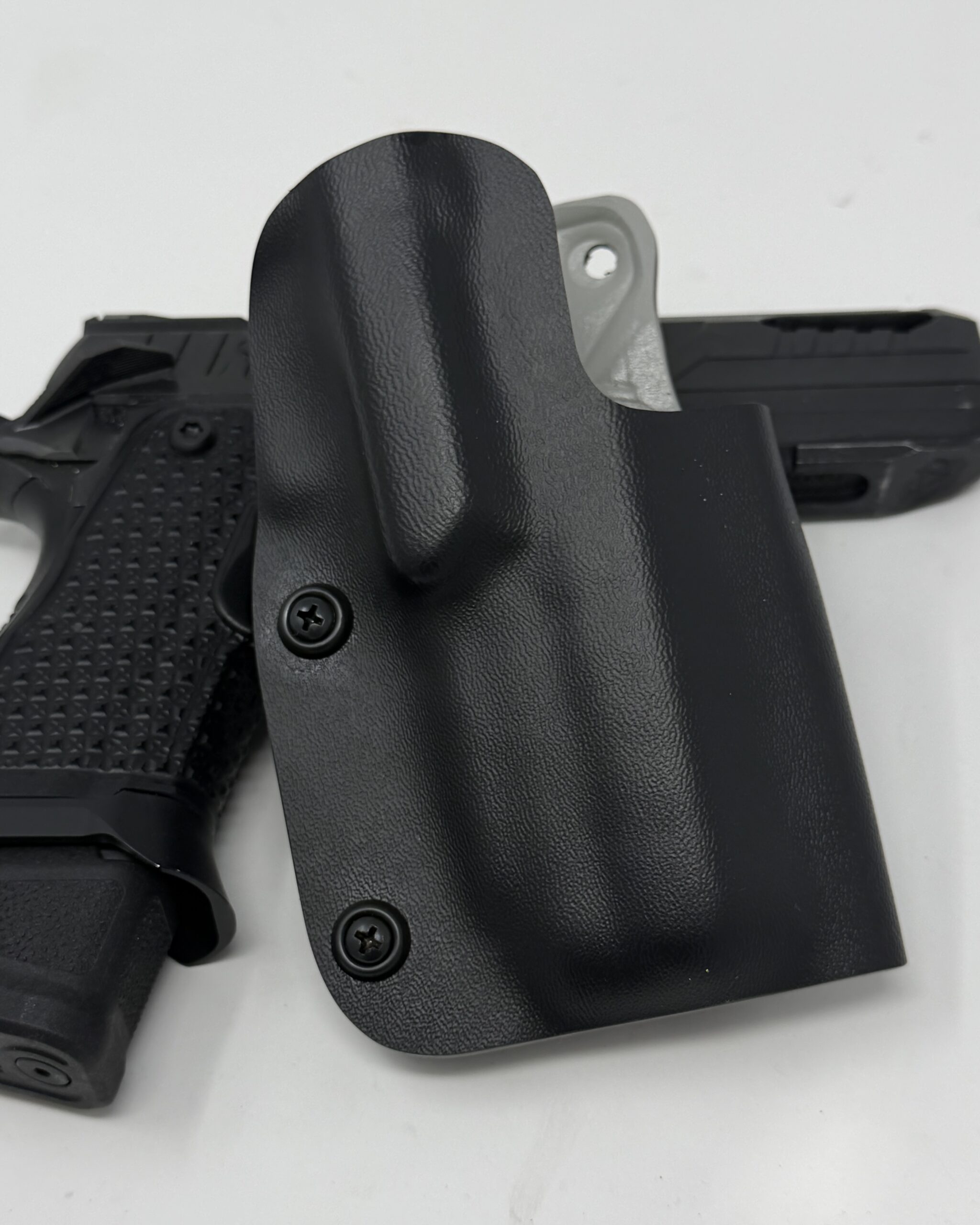 It is available only in the tried and true double layer configuration. This features two layers of .08 thick Kydex to add a great deal of structure to your holster. The extra rigidity supports the low cut that we use, as well as reduces the flex and bounce that happens when you cut this much out of a single layer of Kydex. In addition to the stability, it gives you the ability to further add to the custom look of your rig.