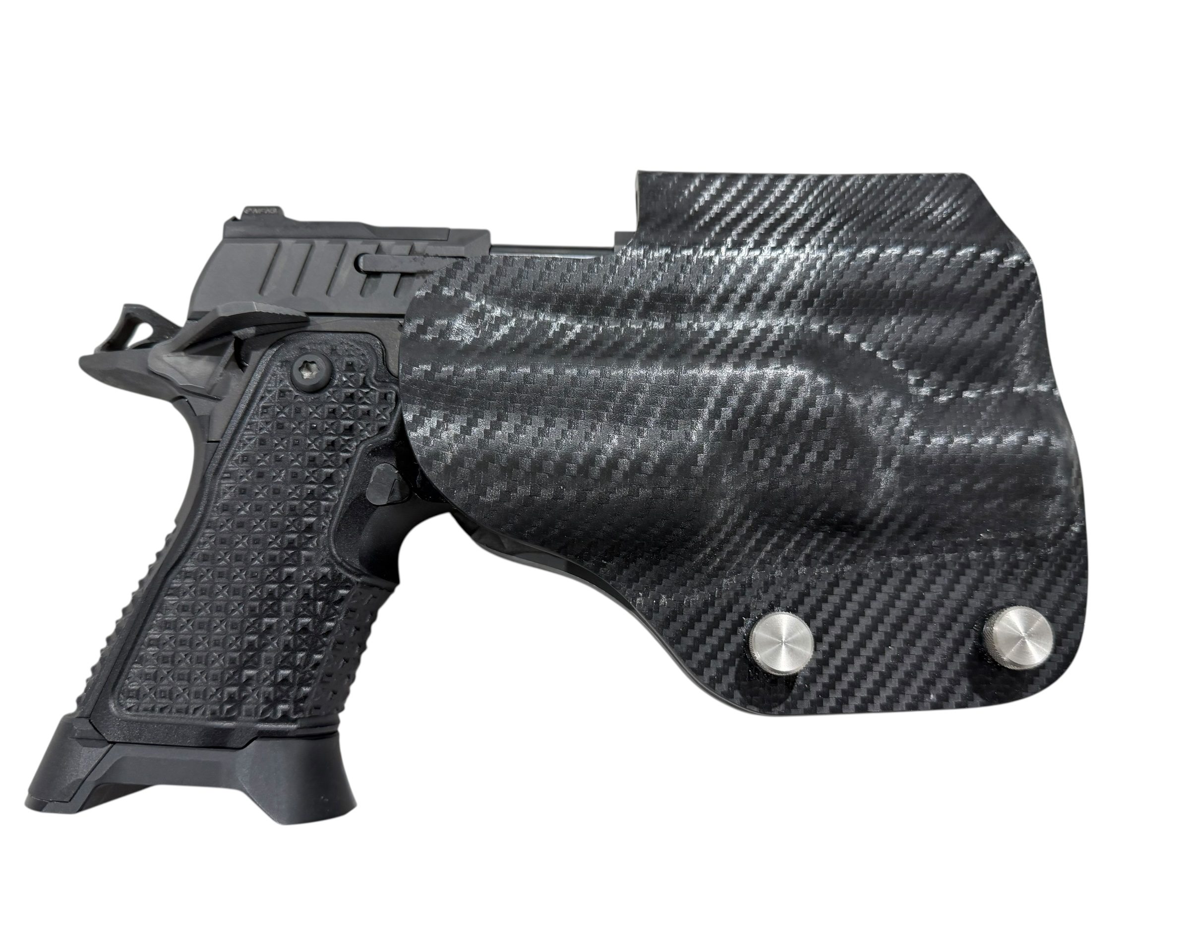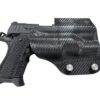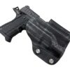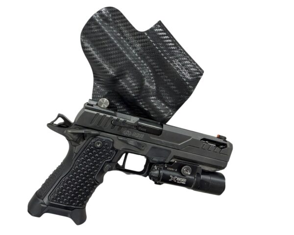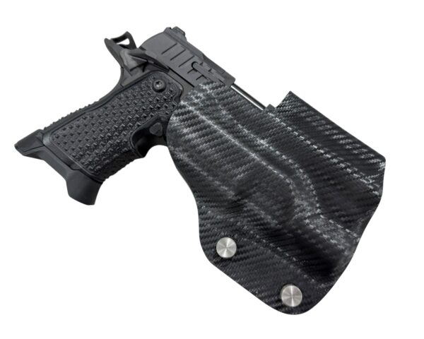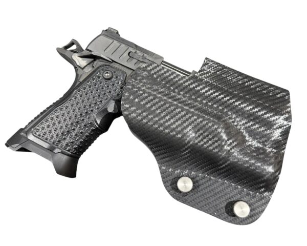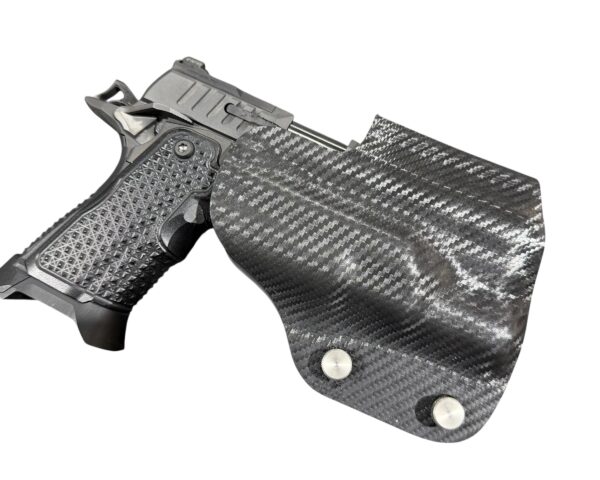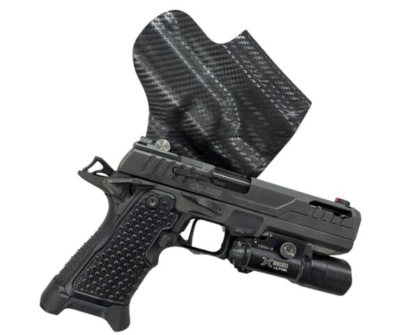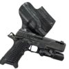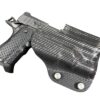 It is available only in the tried and true double layer configuration. This features two layers of .08 or .093 thick Kydex to add a great deal of structure to your holster. The extra rigidity supports the low cut that we use, as well as reduces the flex and bounce that happens when you cut this much out of a single layer of Kydex. In addition to the stability, it gives you the ability to further add to the custom look of your rig. We feature everything from solid colors, carbon fiber look, and many custom camouflage patterns including Kryptek, Multicam, Hexcam and more.