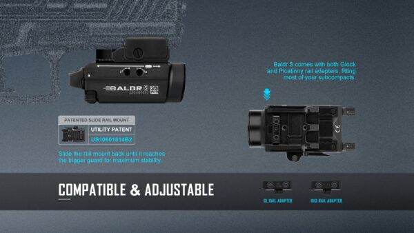 Baldr S: Combining both a highly visible green beam and 800 lumens of white light. Up to 140-minute runtime when the light is set to 100-lumen low mode.