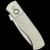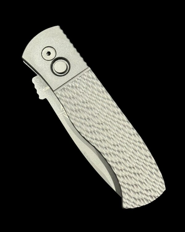 The CQC-7 (E7A05-20CV) features black anodized handles with grip milled texturing, CPM 20cv in stonewash finish, blasted hardware, & black DLC coated mini wide deep carry clip