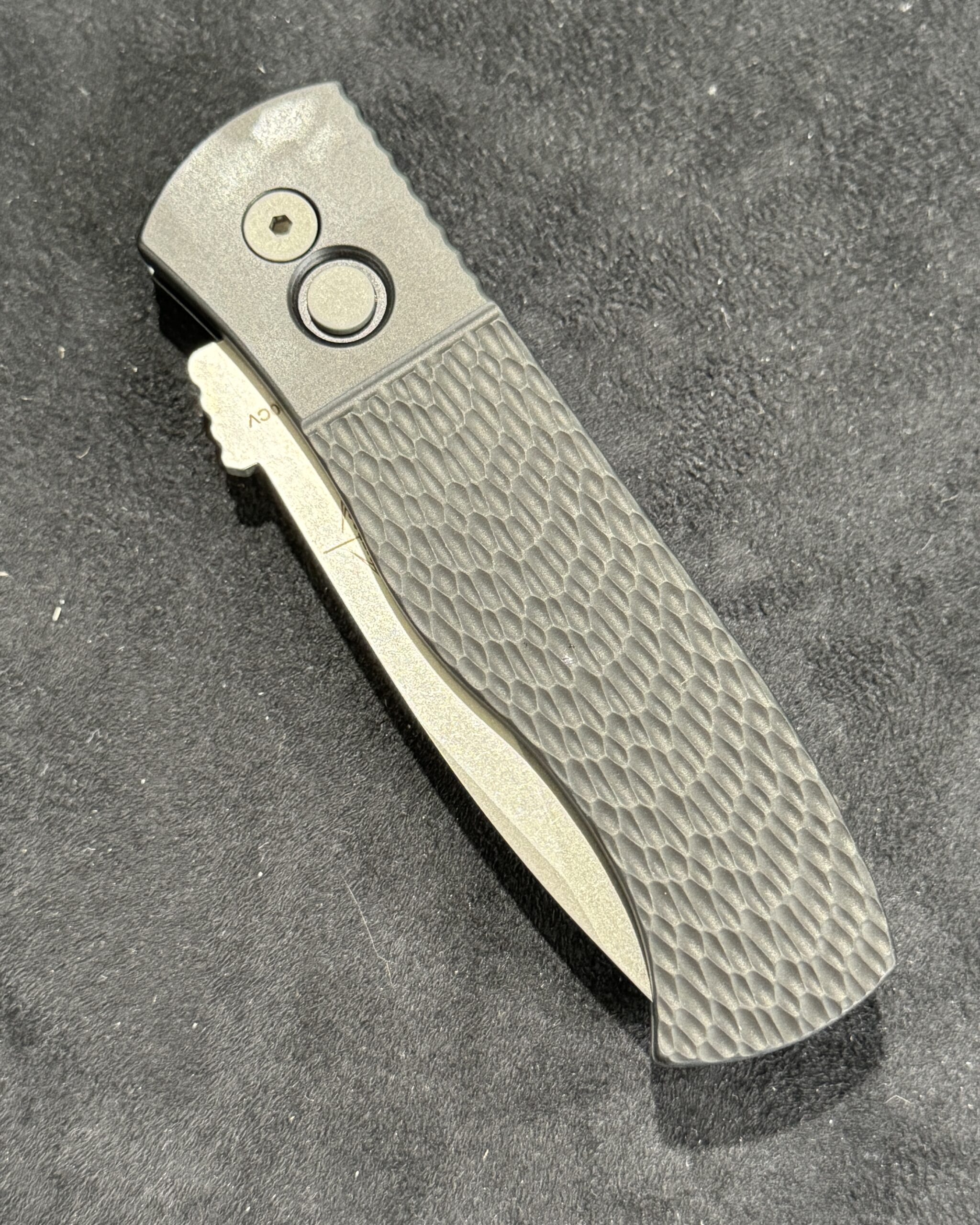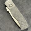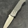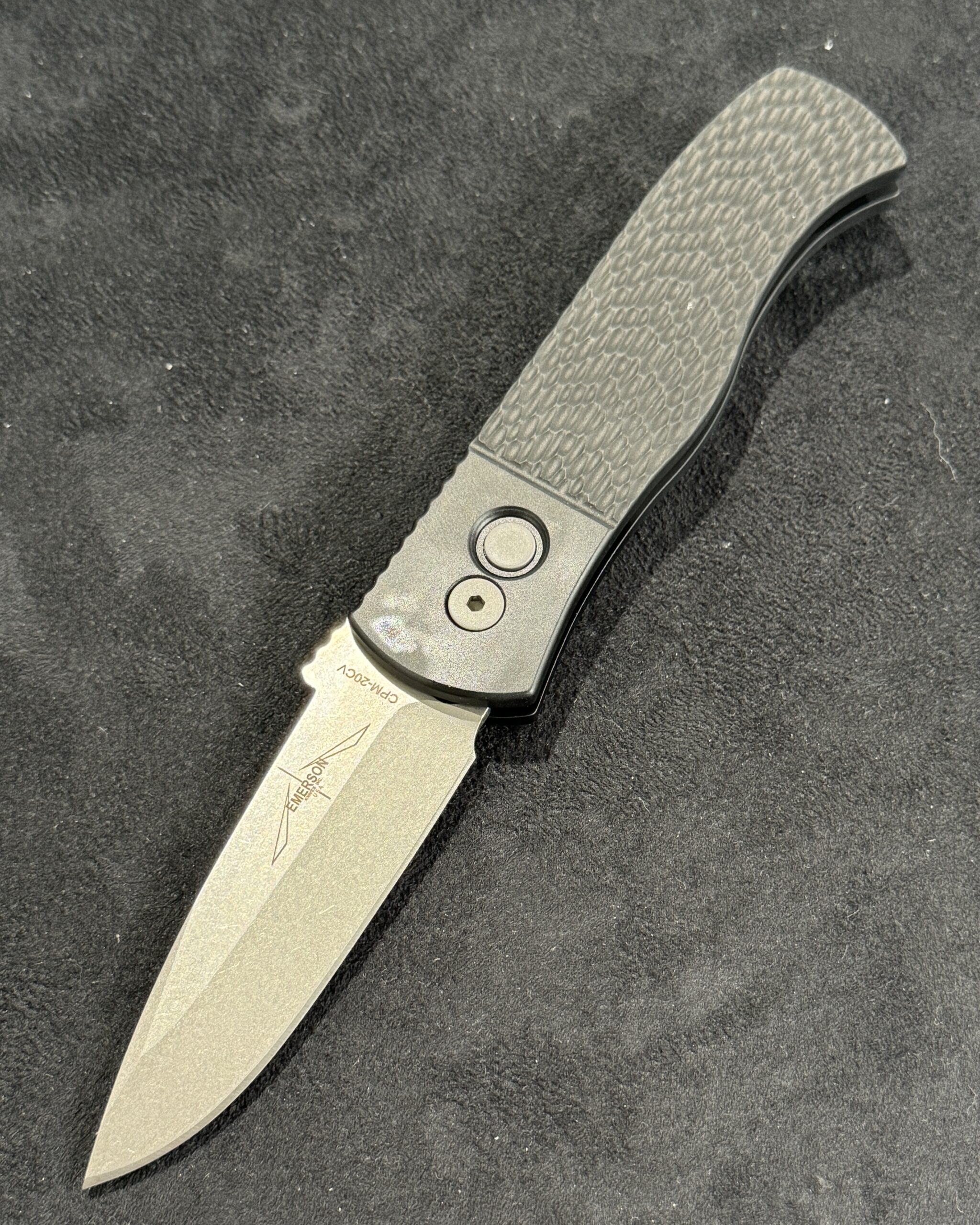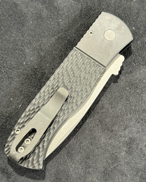 The CQC-7 (E7A05-20CV) features black anodized handles with grip milled texturing, CPM 20cv in stonewash finish, blasted hardware, & black DLC coated mini wide deep carry clip