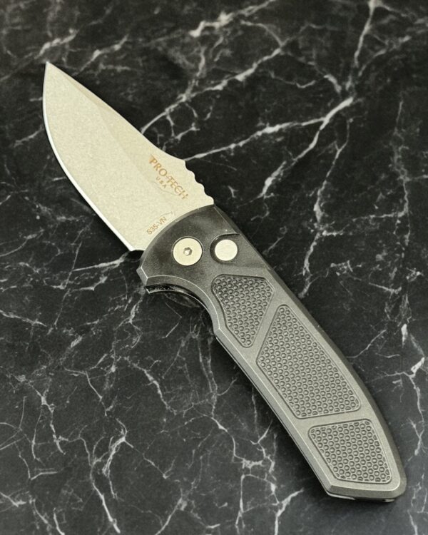 The Short Bladed Rockeye, or SBR for short, is a compact version of our outstanding full sized Rockeye Auto. Both knives are designed by Marine Corps knife designer Les George, who’s ergonomic hard use knives have been faithfully translated to automatic versions by Pro-Tech. The SBR features a compact design, with a 2.5? blade that’s built for a multitude of cutting tasks. A pocket milled spine adds extra grip and depth to the design. The knife snaps open with authority thanks to our Pro-Tech coil spring automatic mechanism. Don’t let it’s size fool you, the SBR is a bantam powerhouse.
