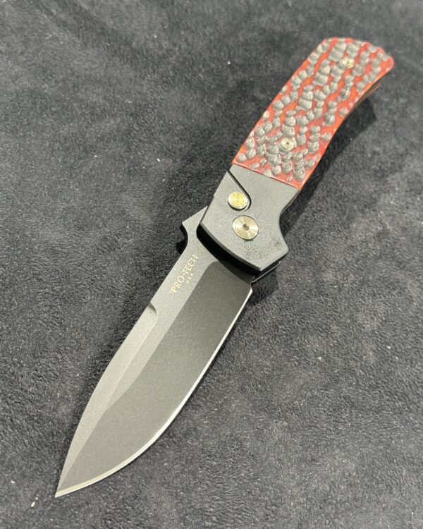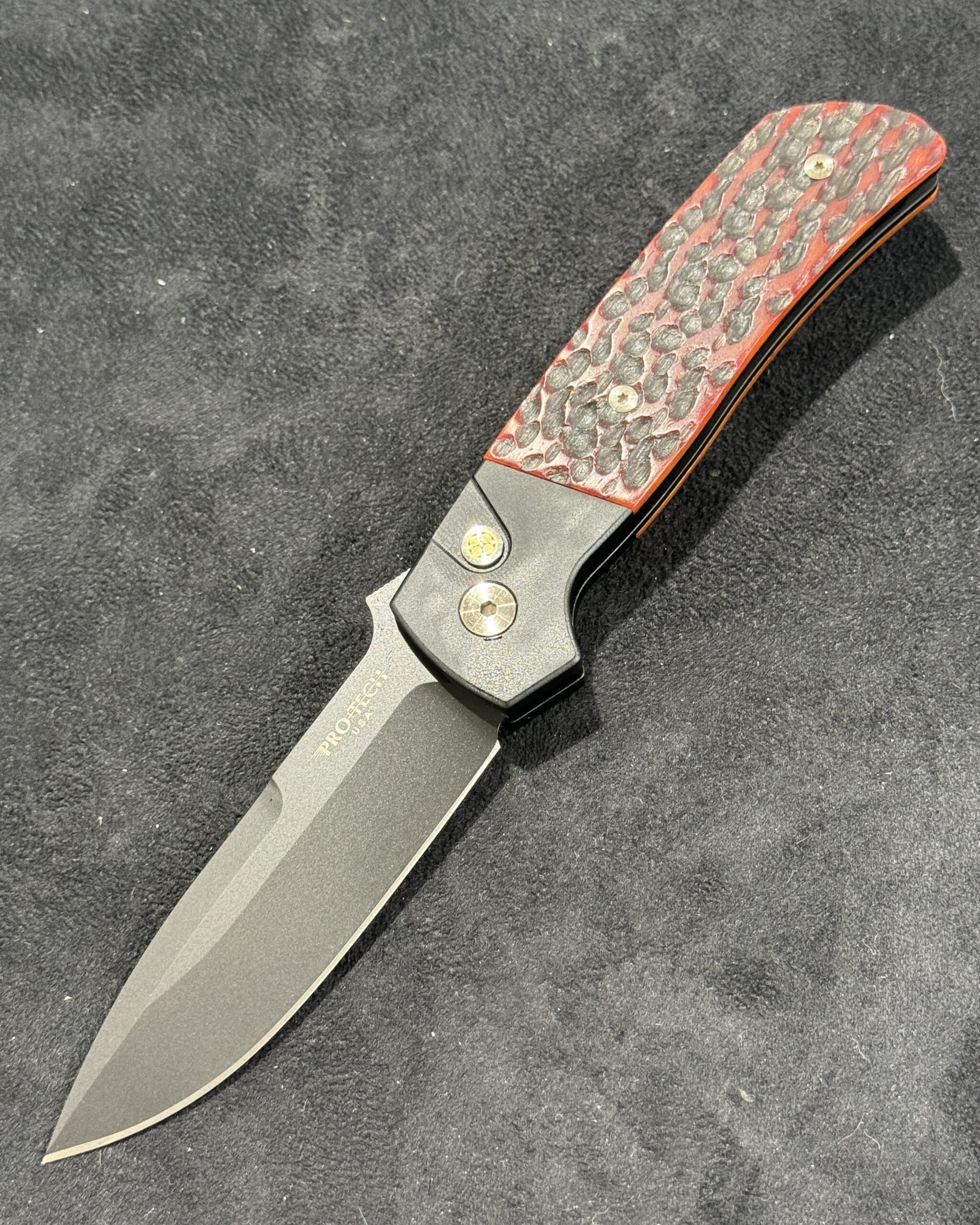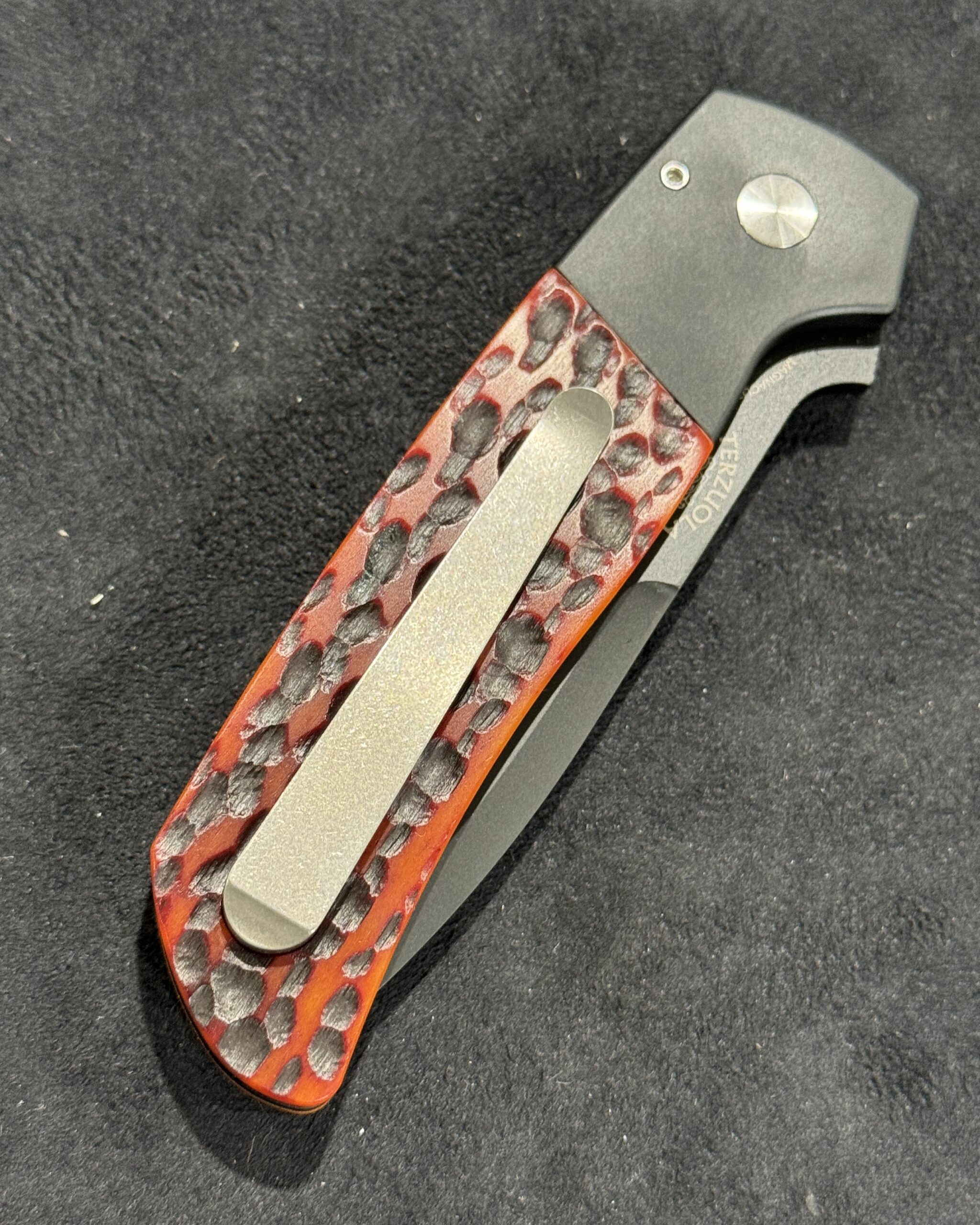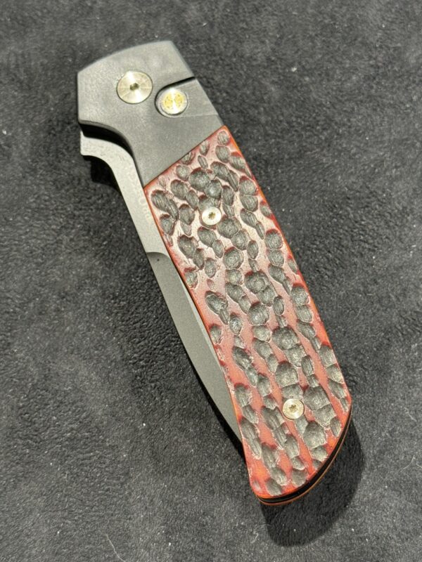 The ATCF Auto (BT2762) features black anodized handles with amber jigged bone inlays, premium Magnacut steel in black DLC finish, mosaic pin inlaid push button, satin hardware, & signature Terzuola machined titanium clip with tumbled finish