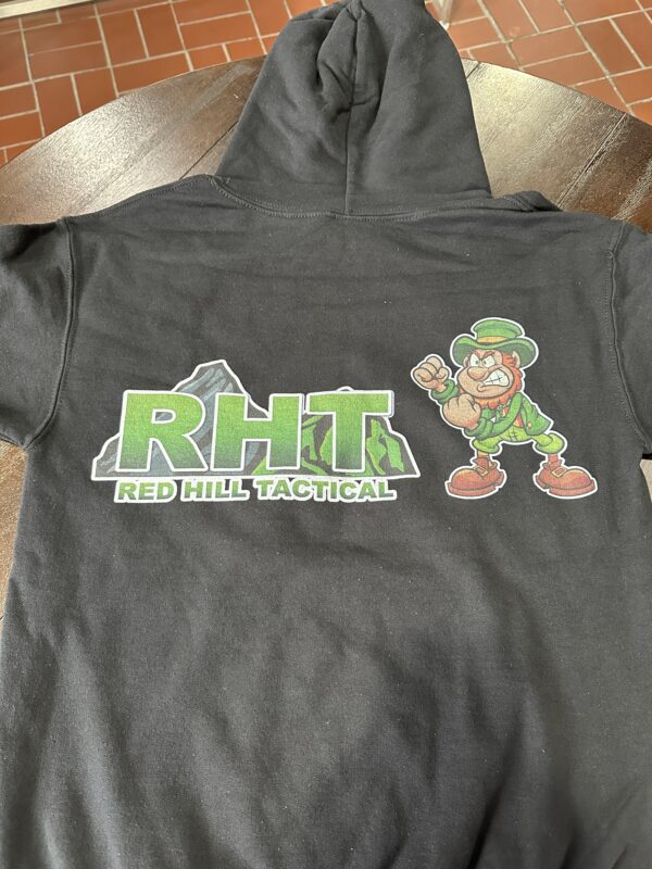 This is a high quality Gildan Hoodie with the Red Hill Tactical special edition St. Patrick’s Day Logo on the front chest, as well as a Large Red Hill Tactical Logo on the back.