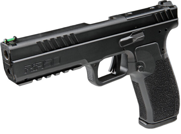 SKU RIA 5.0 Standard – Series RIA-USA – Caliber 9MM – Capacity 10+1 – Barrel 4.91 – Overall Length 8.11 inch 205.99 mm – Overall Width 1.33 inch / 33.78 mm – Overall Height 5.17 inch – Weight 2.12 lbs / 0.96 kg – Front Sight Night Fision Standard Height Green Fiber Optic Serrated – Rear Sight Night Fision Standard Height Blank Serrated – Grips Glass Filled Nylon – Finish E100 Cerakote – Action Semi-Automatic – Trigger Pull 4.5 lbs ± .5 lbs – Purpose Recreational Shooting Conceal Carry