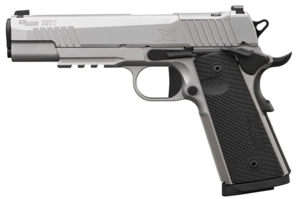 The classic stainless steel 1911 has joined the Red Dot Revolution. Modern upgrades include a Stainless glass bead-blasted XSERIES Slide which comes optic-ready for ultra-low-profile direct-mount red dot optics a stainless sight plate and P-Series XRAY3 Day/Night sights for enhanced sight picture visibility. Additional features include a flat trigger custom G10 grip panels from LOK Grips a railed stainless- steel frame and ambidextrous thumb safety. A DLC finished carbon-steel barrel detachable magazine well (2) 8rd. steel magazines unrivaled custom aesthetics and a serrated front strap bring upgraded features to a timeless platform. Old-school lines with new-school performance. – Optic-Ready Stainless Bead Blast XSeries Slide with Compact Optic Footprint – Stainless Optic Sight Plate – Extended Slide Release and Ambi-Safety Levers – Custom G10 Grip Panels from LOK Grips – Stainless Steel Frame with Undercut and Detachable Magazine Well – P-Series XRAY3 Day/Night Sights – (2) 8-Round Steel Magazines – CALIBER 45 Auto – PISTOL SIZE Full-Size – MAGS INCLUDED (2) 8rd Steel Mag – SIGHTS XRAY3 Day/Night Sights – OPTIC READY Yes – RX FOOTPRINT COMPACT (Shield RMS-c) – SIGHT RADIUS 6.5 in – SLIDE FINISH Stainless Bead Blast – SLIDE MATERIAL Stainless Steel – ELECTRO-OPTIC INSTALLED No – TRIGGER ACTION Single Action Only (SAO) – TRIGGER TYPE Black Serrated Flat Trigger – MANUAL SAFETY Yes – FRAME FINISH Stainless Bead Blast – FRAME MATERIAL Stainless Steel – GRIP TYPE Custom G10 LOK Grips – GRIP MATERIAL Black G10 – GRIP COLOR Black – ACCESSORY RAIL M1913 – BARREL LENGTH 5 in [127 mm] – THREADED BARREL No – BARREL MATERIAL Carbon Steel with Black DLC Finish – OVERALL LENGTH 8.7 in – OVERALL WIDTH 1.4 in – HEIGHT 5.6 in – WEIGHT 42.1 oz w/Magazine