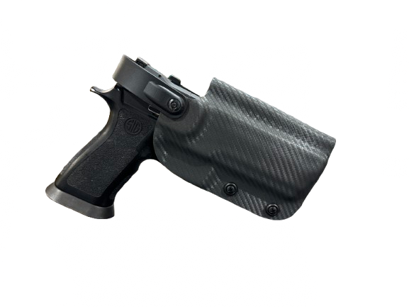 As with all Red Hill Tactical holsters we know that adding optics on your gun is an important option for your Sig. We do offer these with an optics cut that will allow most slide mounted red dots to clear easily including the Trijicon SRO and the new Holosun competition models.